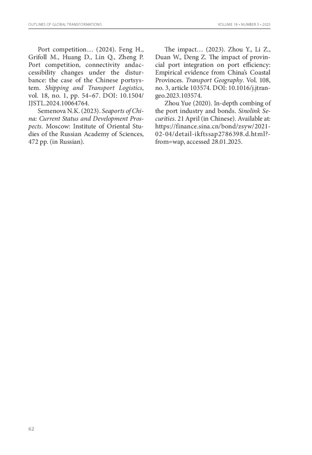 16. Port competition, connectivity andaccessibility changes under the disturbance: the case of the Chinese portsystem / Feng H., Grifoll M., Huang D., Lin Q., Zheng P. // Shipping and Transport Logistics. - 2024. - Vol. 18, N 1. - P. 54-67. - https://doi.org/10.1504/IJSTL.2024.10064764.
