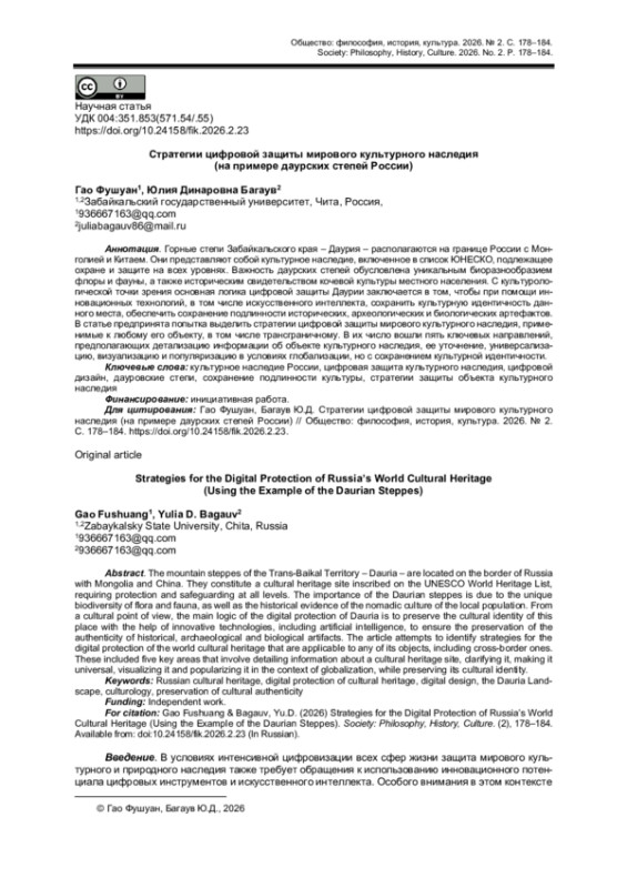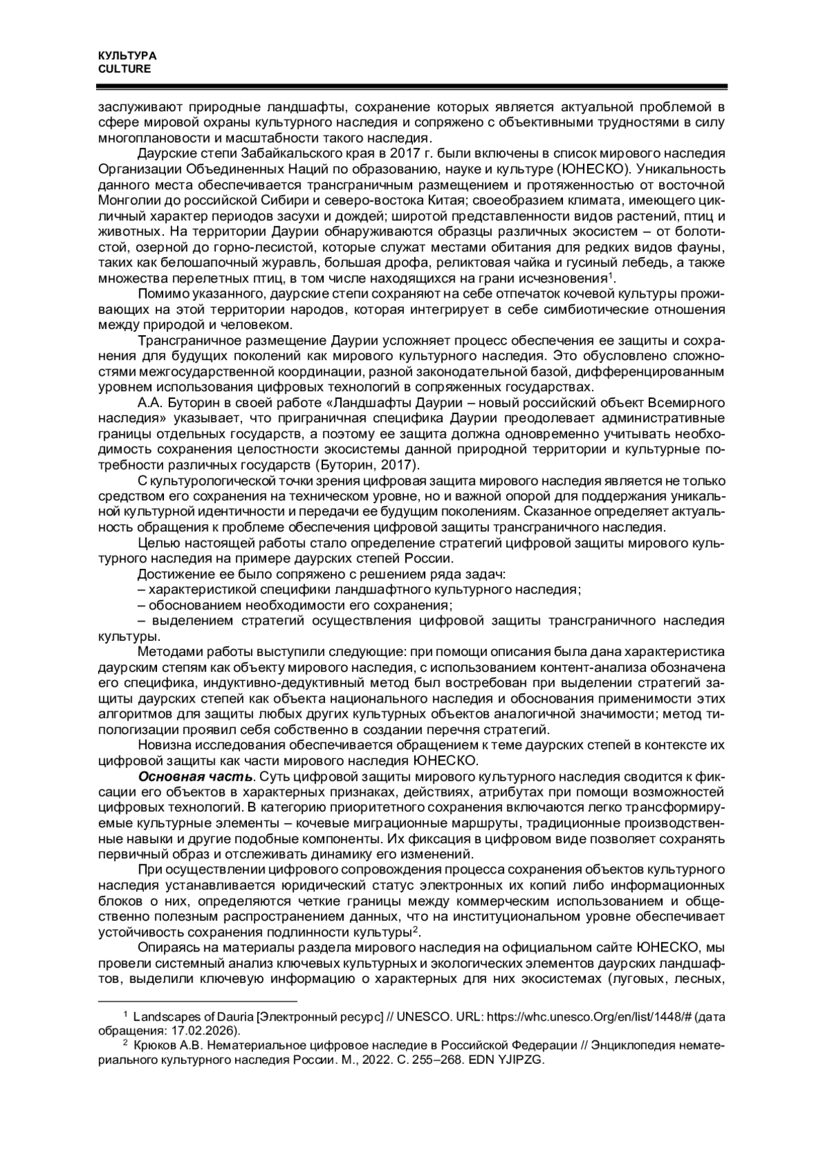 Горные степи Забайкальского края - Даурия - располагаются на границе России с Монголией и Китаем. Они представляют собой культурное наследие, включенное в список ЮНЕСКО, подлежащее охране и защите на всех уровнях. Важность даурских степей обусловлена уникальным биоразнообразием флоры и фауны, а также историческим свидетельством кочевой культуры местного населения. С культурологической точки зрения основная логика цифровой защиты Даурии заключается в том, чтобы при помощи инновационных технологий, в том числе искусственного интеллекта, сохранить культурную идентичность данного места, обеспечить сохранение подлинности исторических, археологических и биологических артефактов. В статье предпринята попытка выделить стратегии цифровой защиты мирового культурного наследия, применимые к любому его объекту, в том числе трансграничному. В их число вошли пять ключевых направлений, предполагающих детализацию информации об объекте культурного наследия, ее уточнение, универсализацию, визуализацию и популяризацию в условиях глобализации, но с сохранением культурной идентичности.