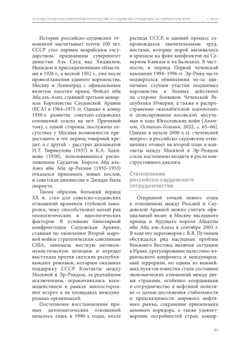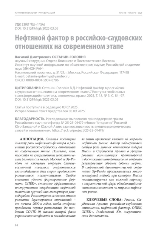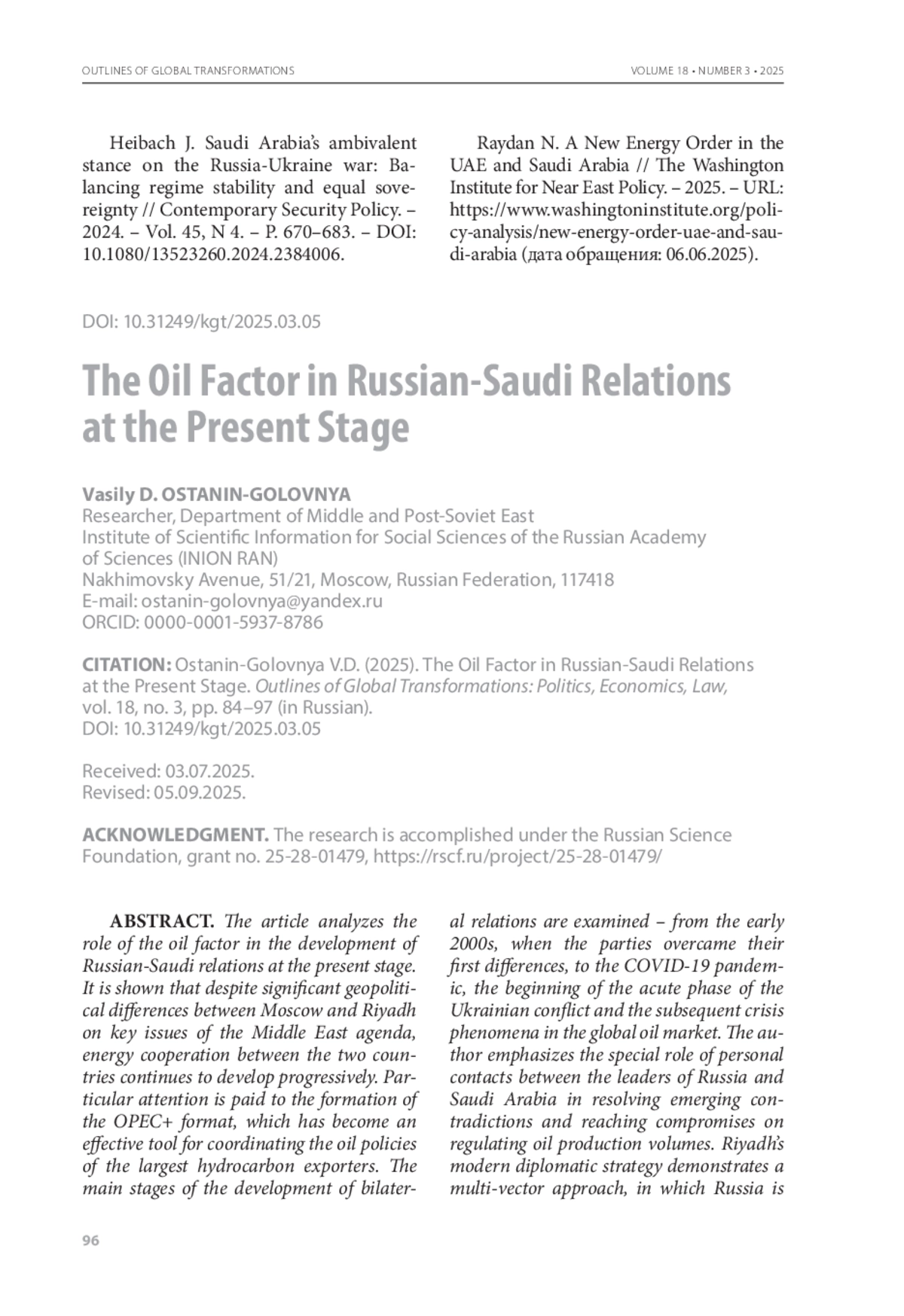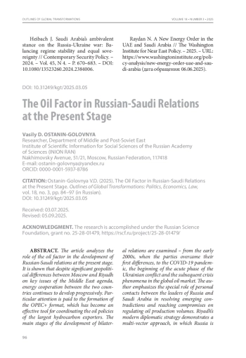 Статья посвящена анализу роли нефтяного фактора в развитии российско-саудовских отношений на современном этапе. Показано, что, несмотря на существенные геополитические разногласия между Москвой и Эр-Риядом по ключевым вопросам ближневосточной повестки, энергетическое взаимодействие двух стран продолжает развиваться поступательно. Особое внимание уделено формированию фор‑ мата ОПЕК+, ставшего эффективным инструментом координации нефтяной политики крупнейших экспортеров углеводородов. Рассмотрены основные этапы развития двусторонних отношений – от начала 2000‑х годов, когда сто́роны преодолели первые разногласия, до пандемии COVID-19, начала острой фазы украинского конфликта и последовавших за этим кризисных явлений на мировом нефтяном рынке. Автор подчеркивает особую роль личных контактов лидеров России и Саудовской Аравии в урегулировании возникающих противоречий и достижении компромиссов по вопросам регулирования объемов добычи нефти. В современной дипломатической стратегии Эр-Рияда прослеживается многовекторный подход, при котором Россия позиционируется как важный партнер в энергетической сфере, обладающий значительным влиянием на мировом нефтяном рынке.