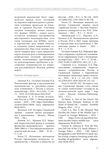 9. Серегина А.А., Галицкая Е.А. Перспективные направления энергетического сотрудничества России и Саудовской Аравии // Евразийская интеграция: экономика, право, политика. - 2024. - № 4. - С. 141-152. - https://doi.org/10.22394/2073-2929-2024-04-141-152.