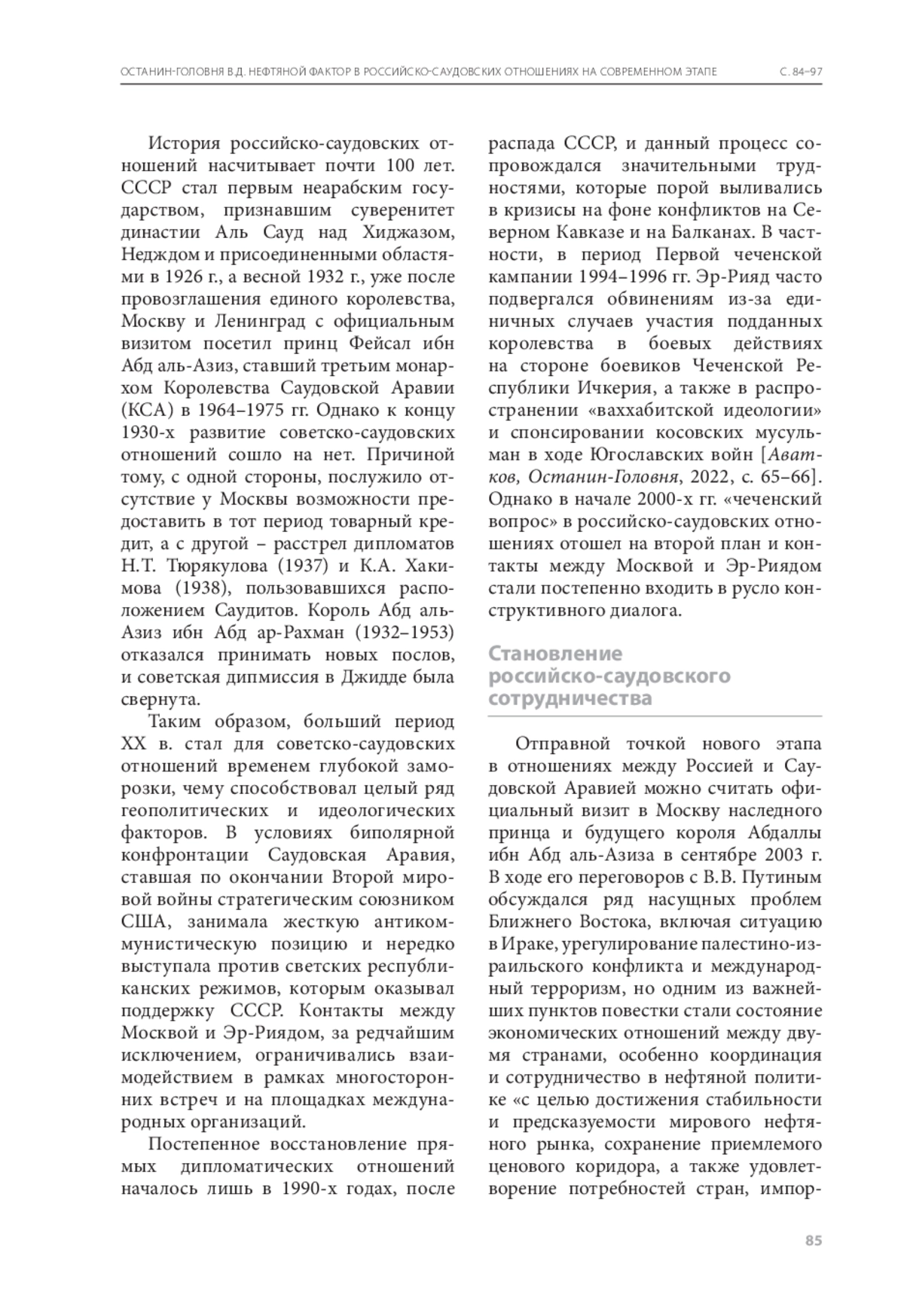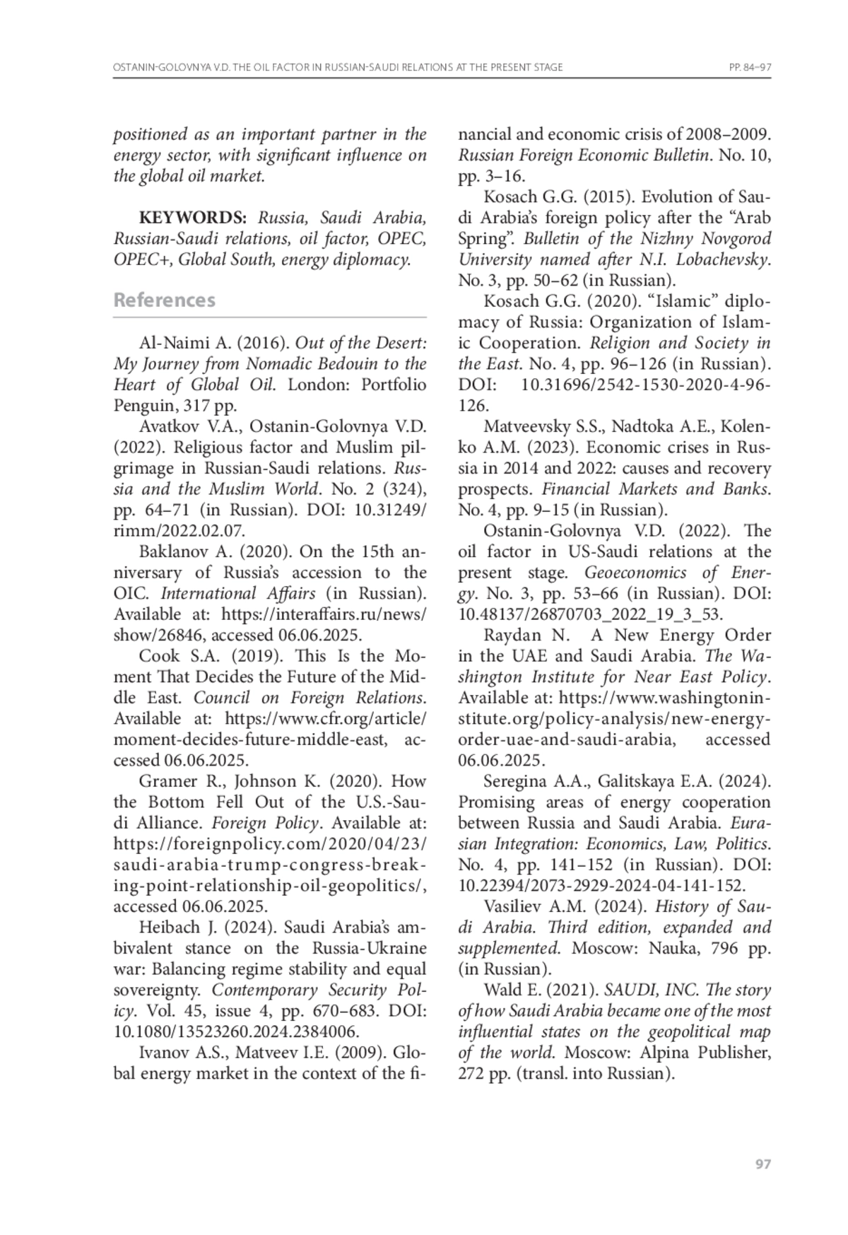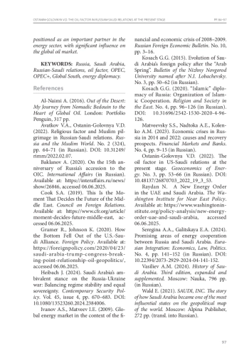 8. Останин-Головня В.Д. Нефтяной фактор в американо-саудовских отношениях на современном этапе // Геоэкономика энергетики. - 2022. - № 3. - С. 53-66. - https://doi.org/10.48137/26870703_2022_19_3_53.