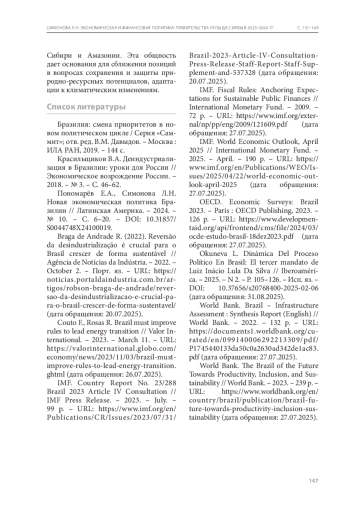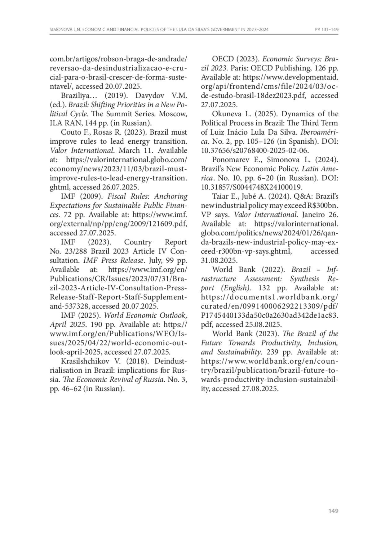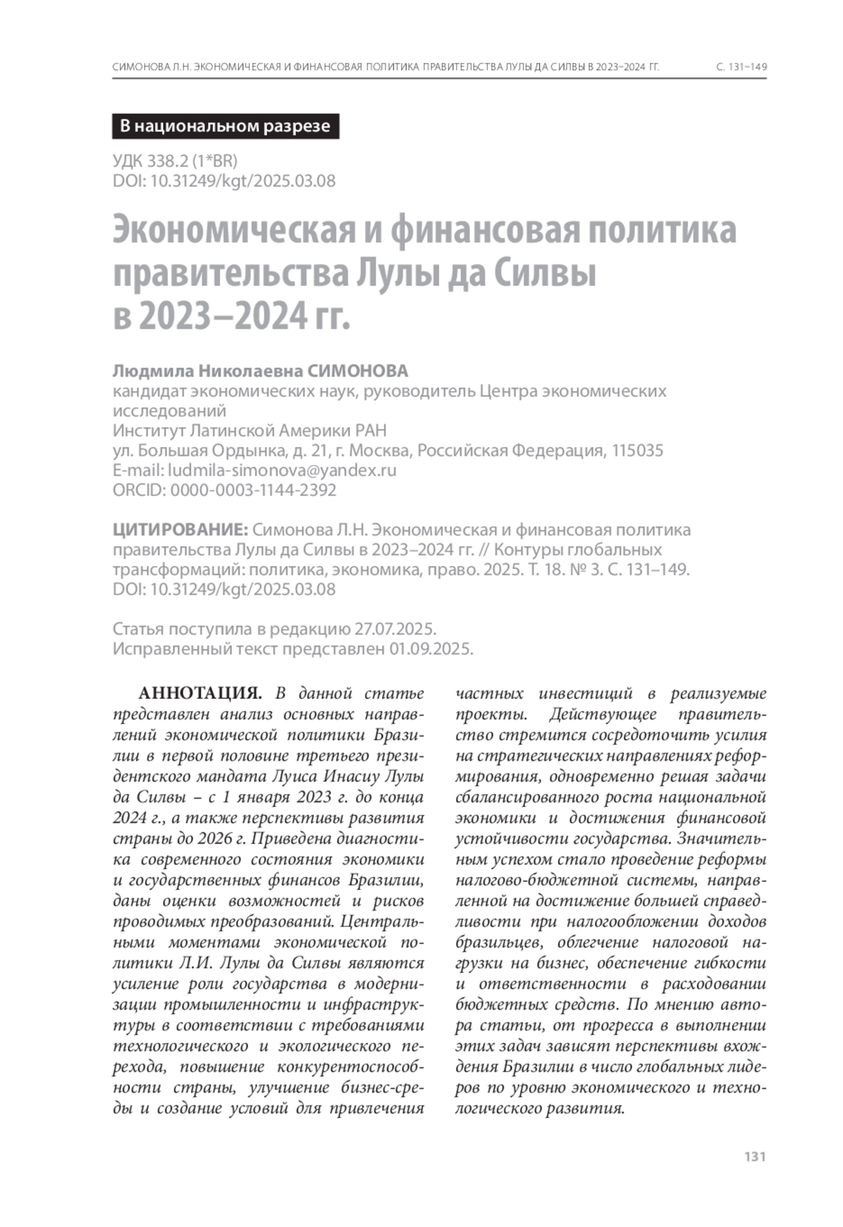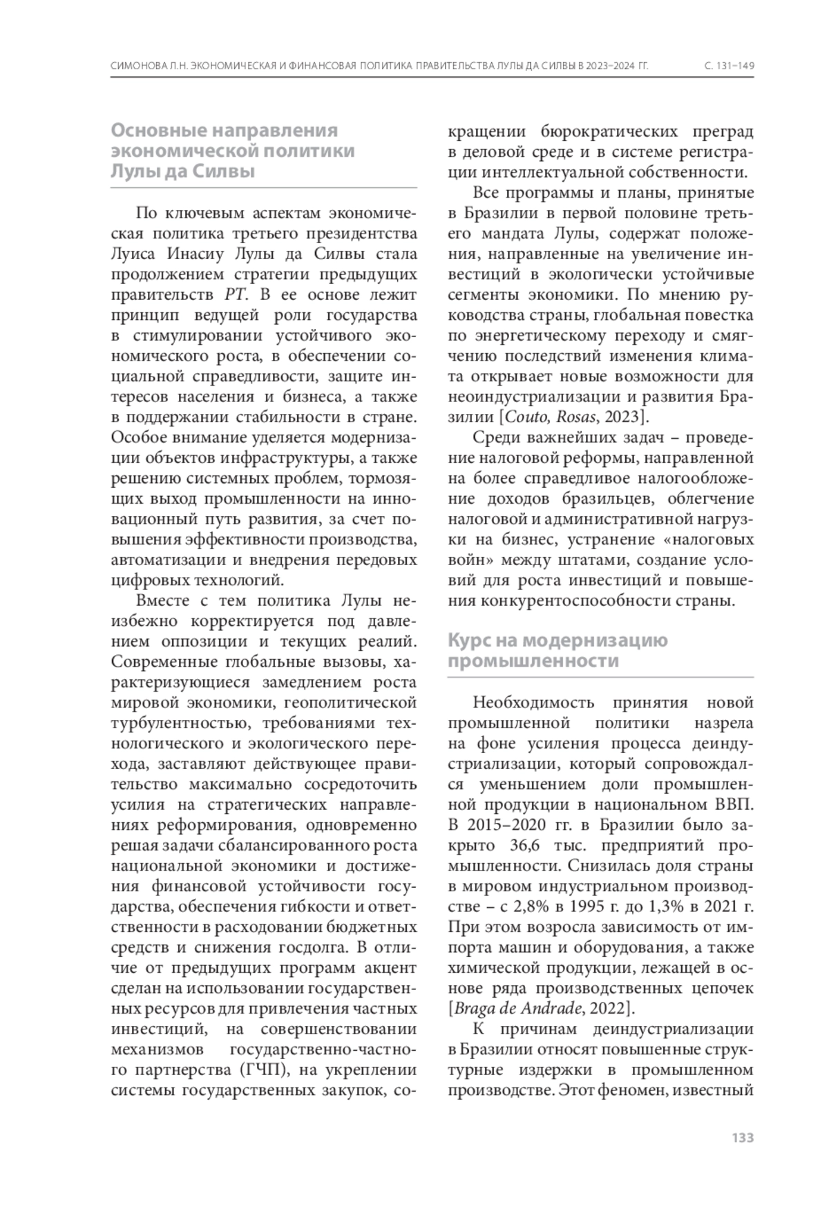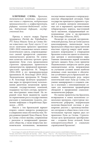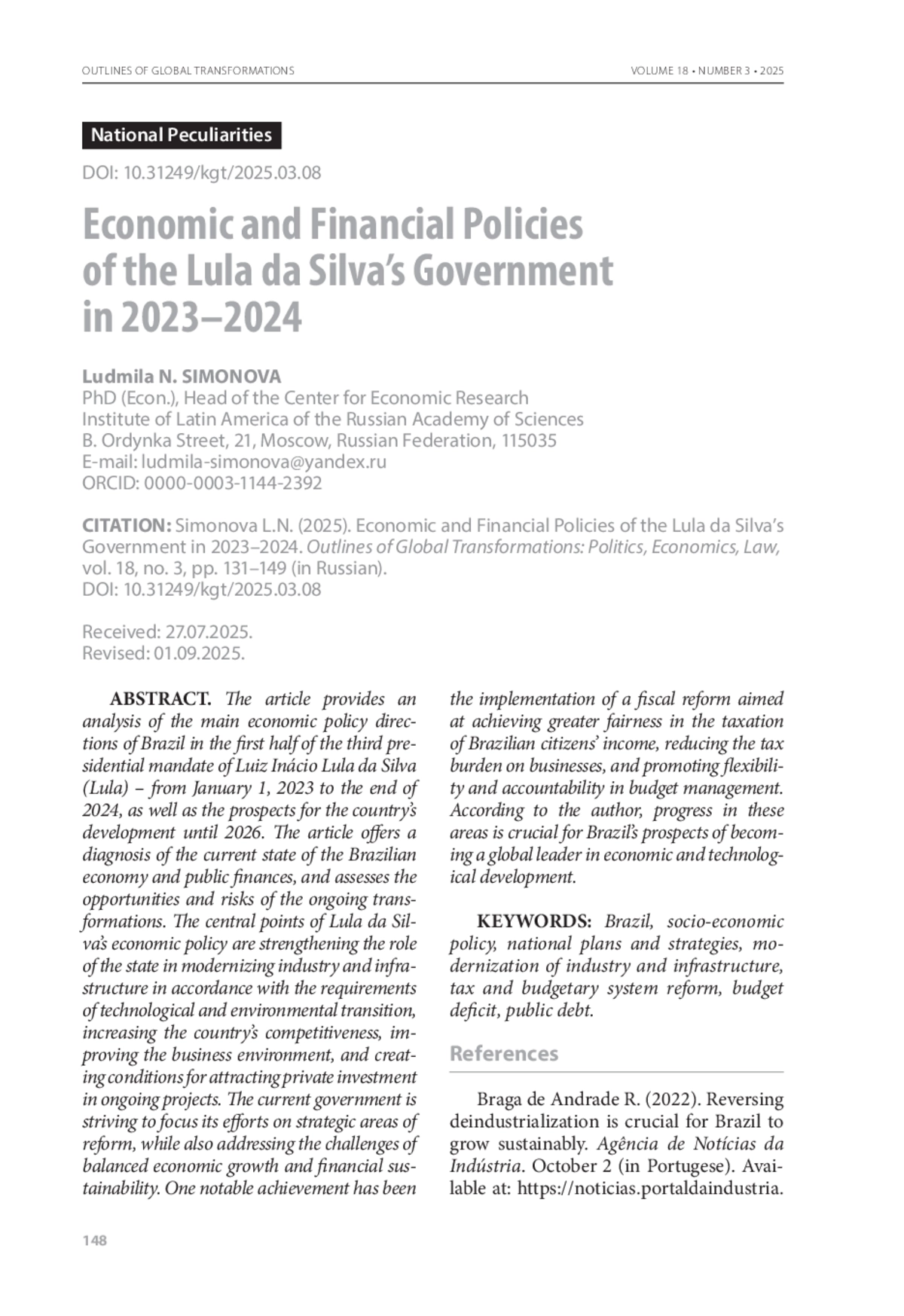 В данной статье представлен анализ основных направлений экономической политики Бразилии в первой половине третьего президентского мандата Луиса Инасиу Лулы да Силвы – с 1 января 2023 г. до конца 2024 г., а также перспективы развития страны до 2026 г. Приведена диагностика современного состояния экономики и государственных финансов Бразилии, даны оценки возможностей и рисков проводимых преобразований. Центральными моментами экономической политики Л. И. Лулы да Силвы являются усиление роли государства в модернизации промышленности и инфраструтуры в соответствии с требованиями технологического и экологического перехода, повышение конкурентоспособности страны, улучшение бизнес-среды и создание условий для привлечения частных инвестиций в реализуемые проекты. Действующее правительство стремится сосредоточить усилия на стратегических направлениях реформирования, одновременно решая задачи сбалансированного роста национальной экономики и достижения финансовой устойчивости государства. Значительным успехом стало проведение реформы налогово-бюджетной системы, направленной на достижение большей справедливости при налогообложении доходов бразильцев, облегчение налоговой нагрузки на бизнес, обеспечение гибкости и ответственности в расходовании бюджетных средств. По мнению автора статьи, от прогресса в выполнении этих задач зависят перспективы вхождения Бразилии в число глобальных лидеров по уровню экономического и технологического развития.