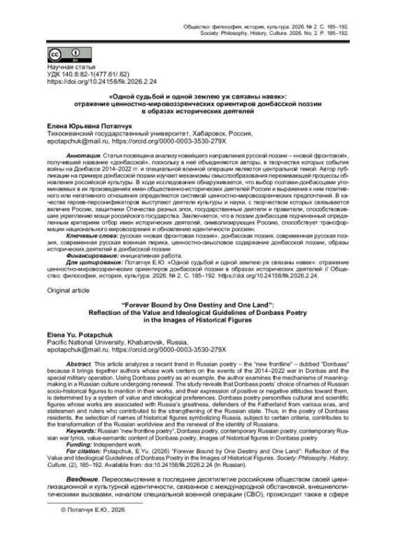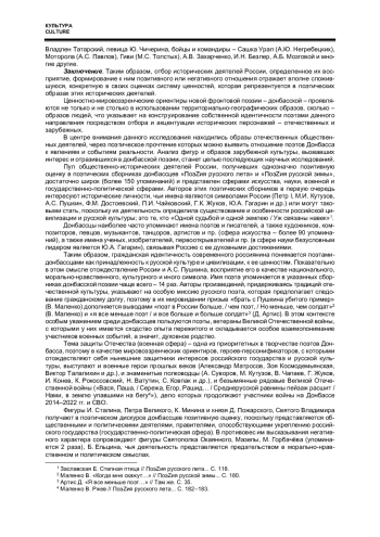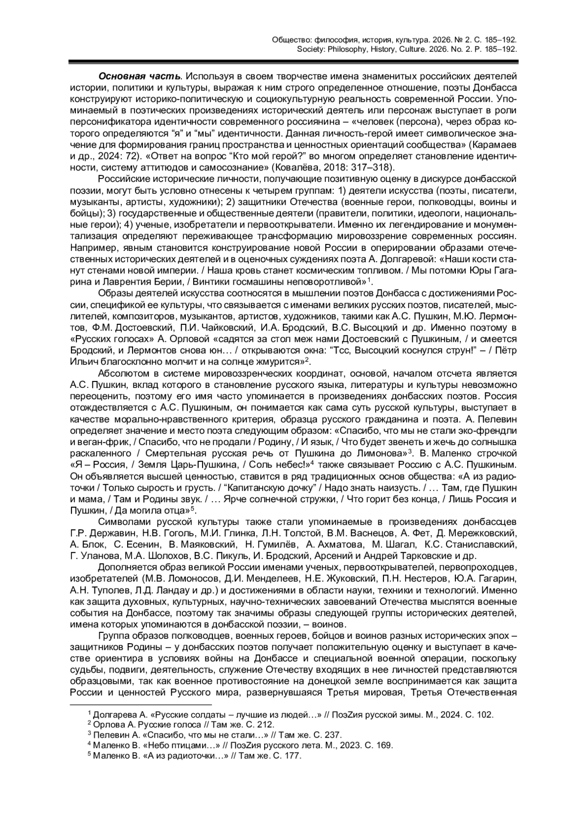 В ходе исследования обнаруживается, что выбор поэтами-донбассцами упоминаемых в их произведениях имен общественно-исторических деятелей России и выражение к ним позитивного или негативного отношения определяются системой ценностно-мировоззренческих предпочтений. В качестве героев-персонификаторов выступают деятели культуры и науки, с творчеством которых связывается величие России, защитники Отечества разных эпох, государственные деятели и правители, способствовавшие укреплению мощи российского государства.