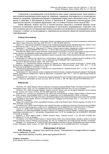 10. Проваторова О.Н. Христианские мотивы в современной военной поэзии о специальной военной операции // Вестник Донецкого национального университета. Серия Д. Филология и психология. 2024. № 6. С. 100-113. DOI: 10.5281/zenodo.14513574 EDN: WVWONR
