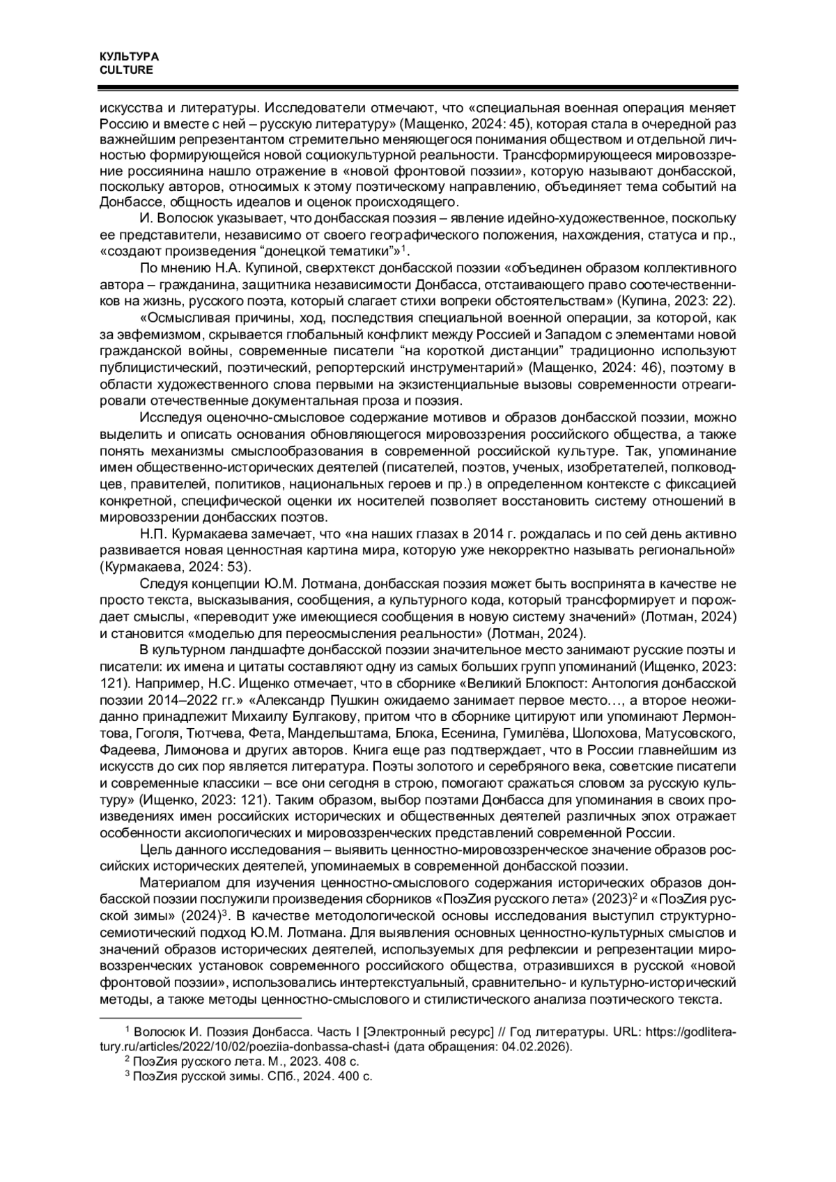2. Ищенко Н.С. Культурный ландшафт России в книге донбасской военной поэзии “Великий Блокпост” (2023) // Гуманитарный вектор. 2023. Т. 18, № 4. С. 115-123. DOI: 10.21209/1996-7853-2023-18-4-115-123 EDN: TYUQGA