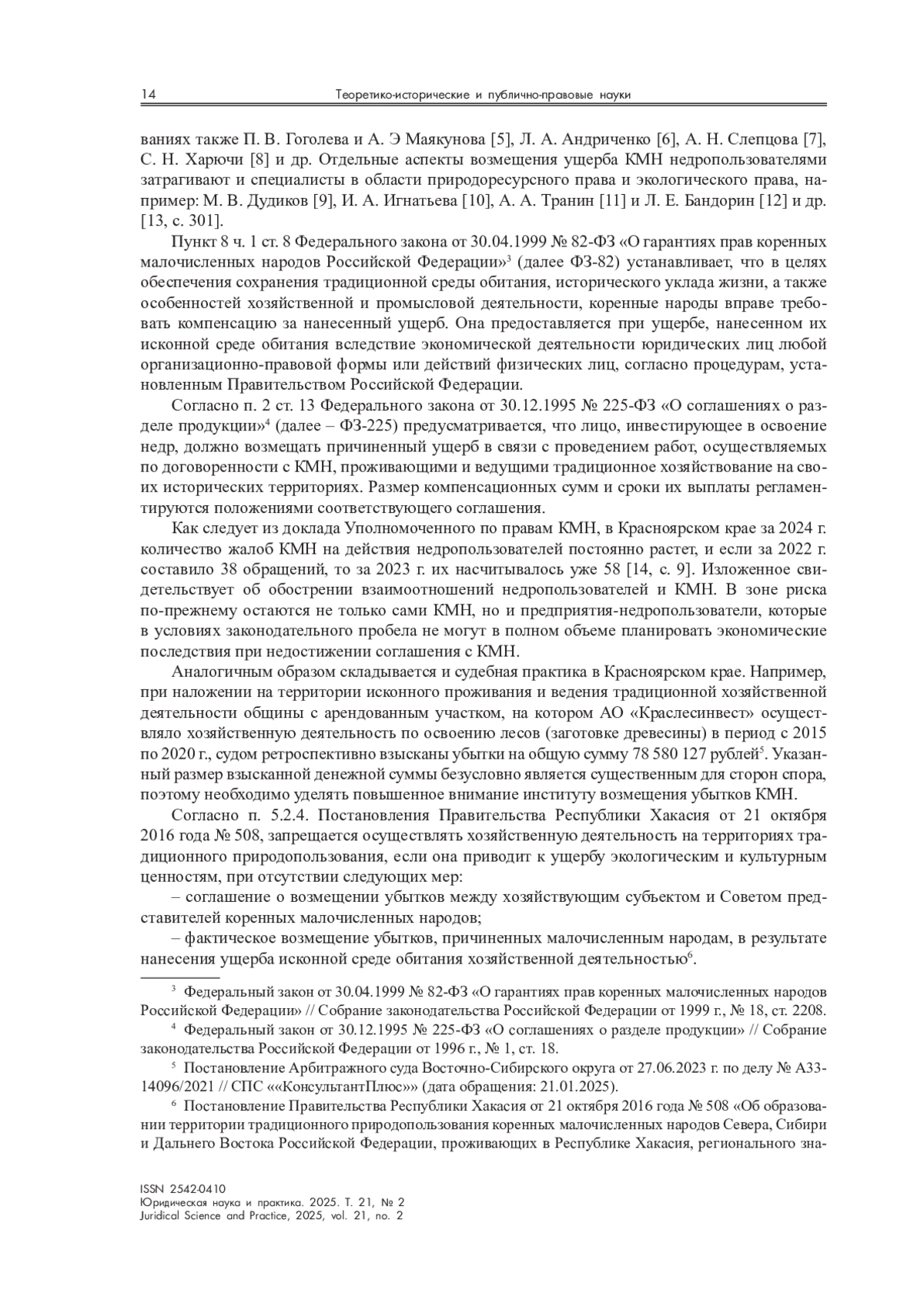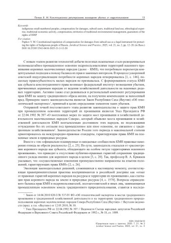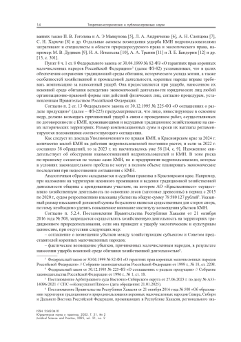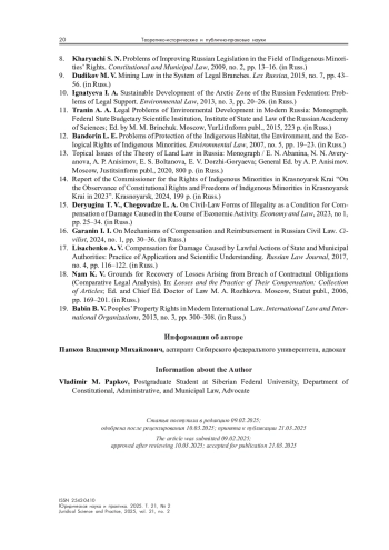 8. Харючи С. Н. Проблемы совершенствования российского законодательства в области прав коренных малочисленных народов // Конституционное и муниципальное право. 2009. № 2. С. 13-16.