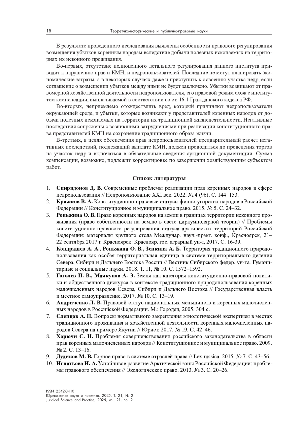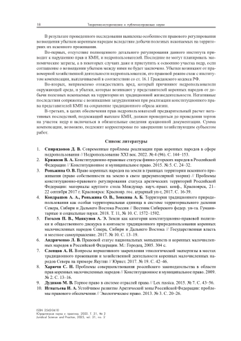 1. Спиридонов Д. В. Современные проблемы реализации прав коренных народов в сфере недропользования // Недропользование XXI век. 2022. № 4 (96). C. 144-153.
