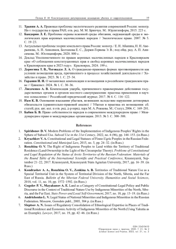 7. Слепцов А. Н. Вопросы нормативного закрепления этнологической экспертизы в местах традиционного проживания и хозяйственной деятельности коренных малочисленных народов Севера на примере Якутии // Юрист. 2017. № 19. С. 42-46.
