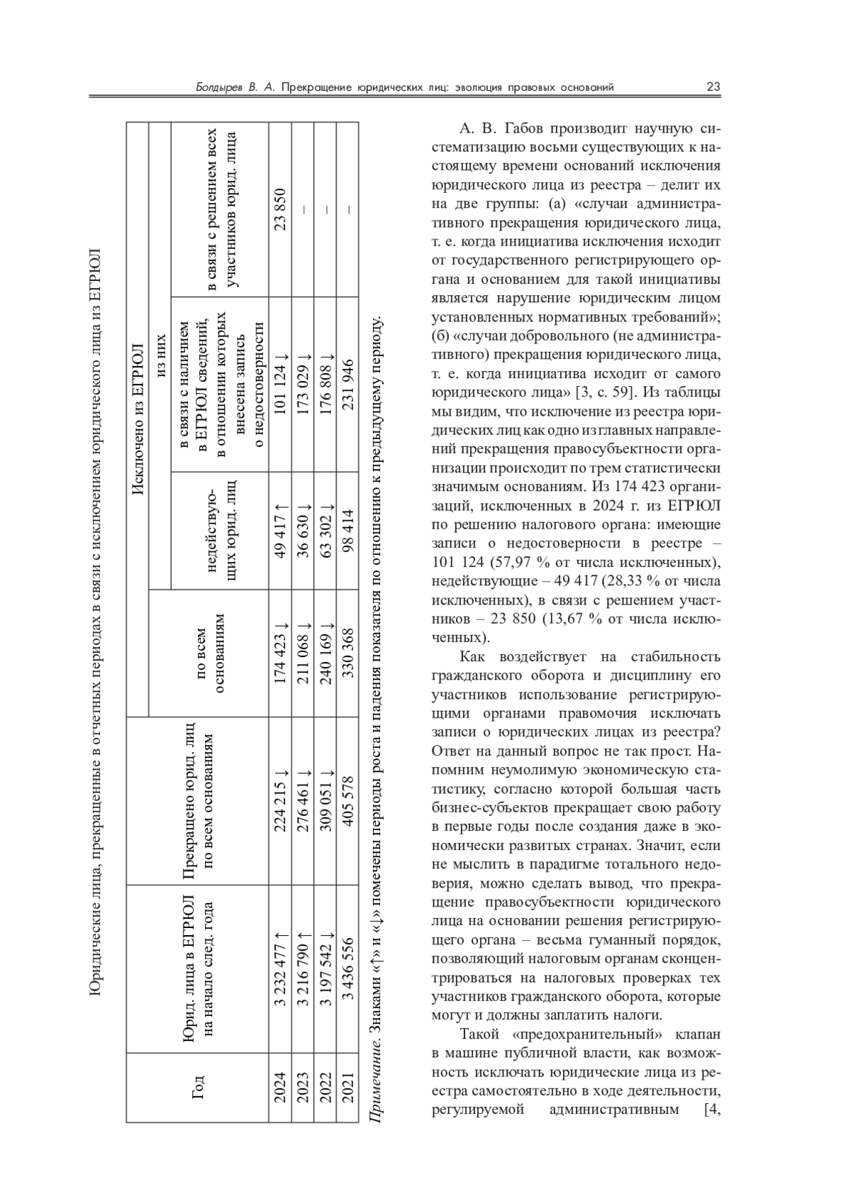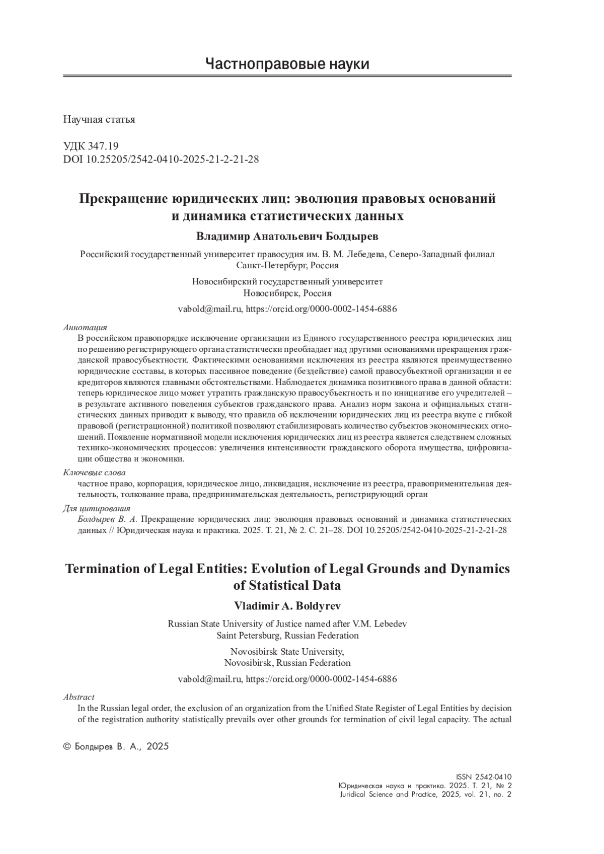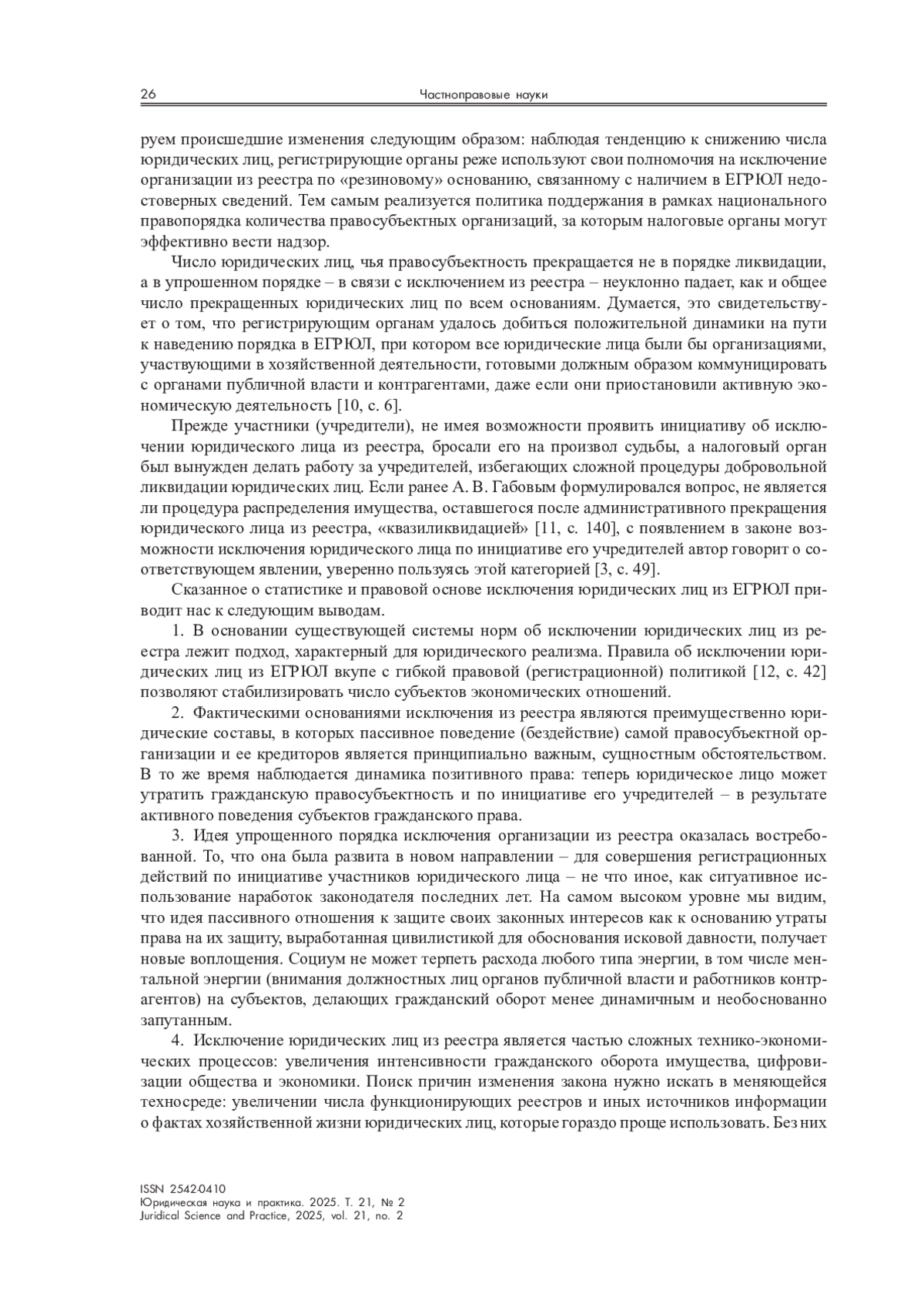 В российском правопорядке исключение организации из Единого государственного реестра юридических лиц по решению регистрирующего органа статистически преобладает над другими основаниями прекращения гражданской правосубъектности. Фактическими основаниями исключения из реестра являются преимущественно юридические составы, в которых пассивное поведение (бездействие) самой правосубъектной организации и ее кредиторов являются главными обстоятельствами. Наблюдается динамика позитивного права в данной области: теперь юридическое лицо может утратить гражданскую правосубъектность и по инициативе его учредителей – в результате активного поведения субъектов гражданского права. Анализ норм закона и официальных статистических данных приводит к выводу, что правила об исключении юридических лиц из реестра вкупе с гибкой правовой (регистрационной) политикой позволяют стабилизировать количество субъектов экономических отношений. Появление нормативной модели исключения юридических лиц из реестра является следствием сложных технико-экономических процессов: увеличения интенсивности гражданского оборота имущества, цифровизации общества и экономики.