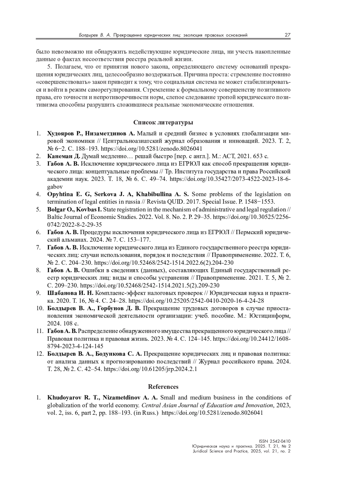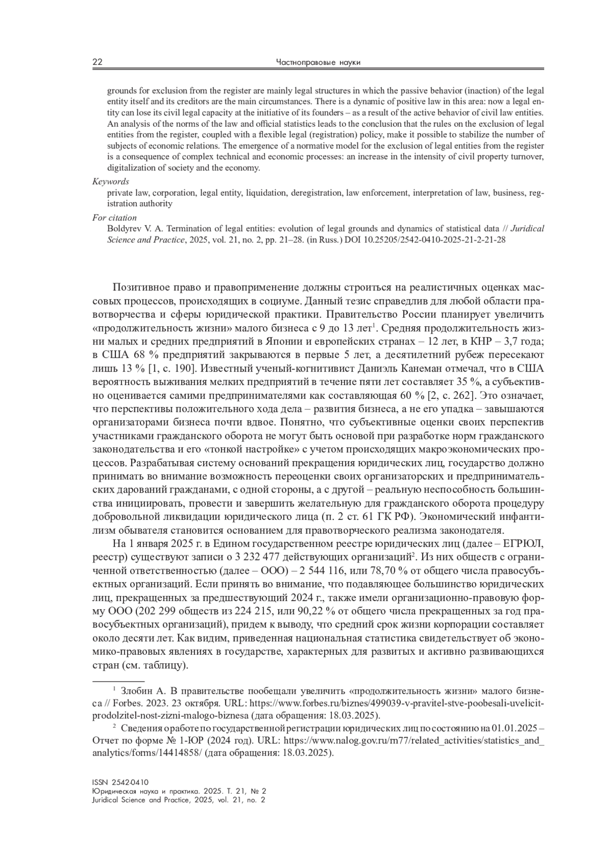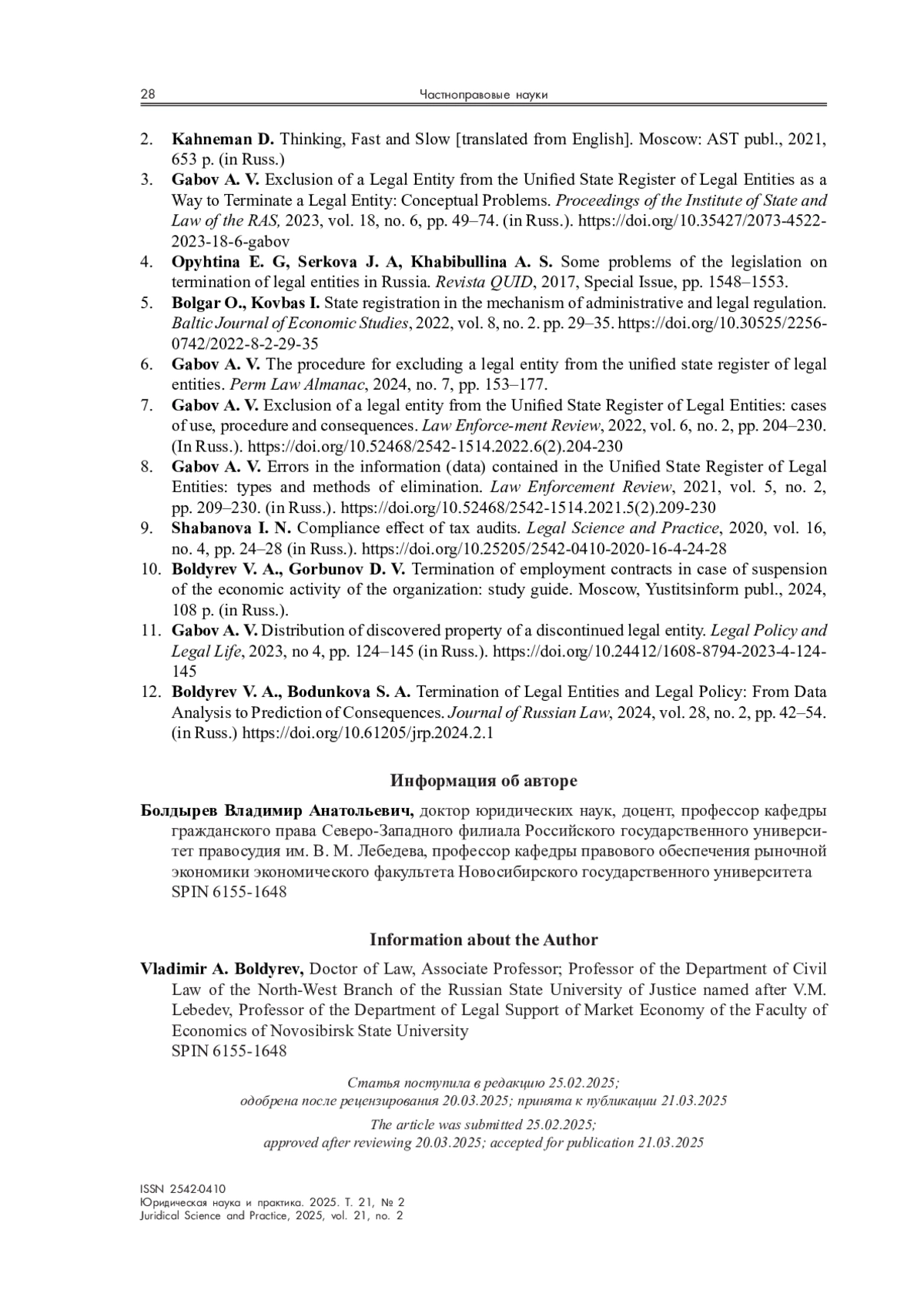 В российском правопорядке исключение организации из Единого государственного реестра юридических лиц по решению регистрирующего органа статистически преобладает над другими основаниями прекращения гражданской правосубъектности. Фактическими основаниями исключения из реестра являются преимущественно юридические составы, в которых пассивное поведение (бездействие) самой правосубъектной организации и ее кредиторов являются главными обстоятельствами. Наблюдается динамика позитивного права в данной области: теперь юридическое лицо может утратить гражданскую правосубъектность и по инициативе его учредителей – в результате активного поведения субъектов гражданского права. Анализ норм закона и официальных статистических данных приводит к выводу, что правила об исключении юридических лиц из реестра вкупе с гибкой правовой (регистрационной) политикой позволяют стабилизировать количество субъектов экономических отношений. Появление нормативной модели исключения юридических лиц из реестра является следствием сложных технико-экономических процессов: увеличения интенсивности гражданского оборота имущества, цифровизации общества и экономики.