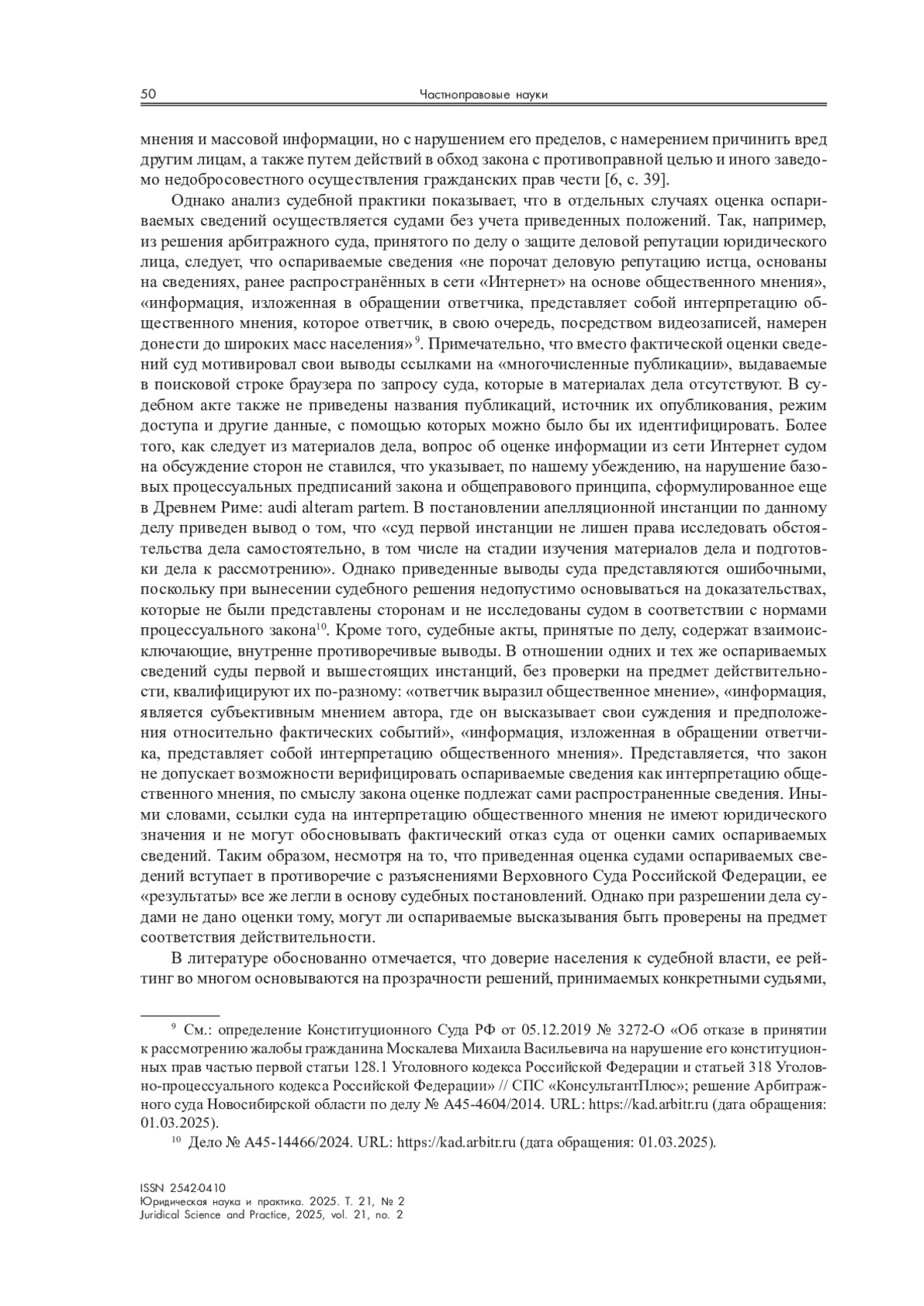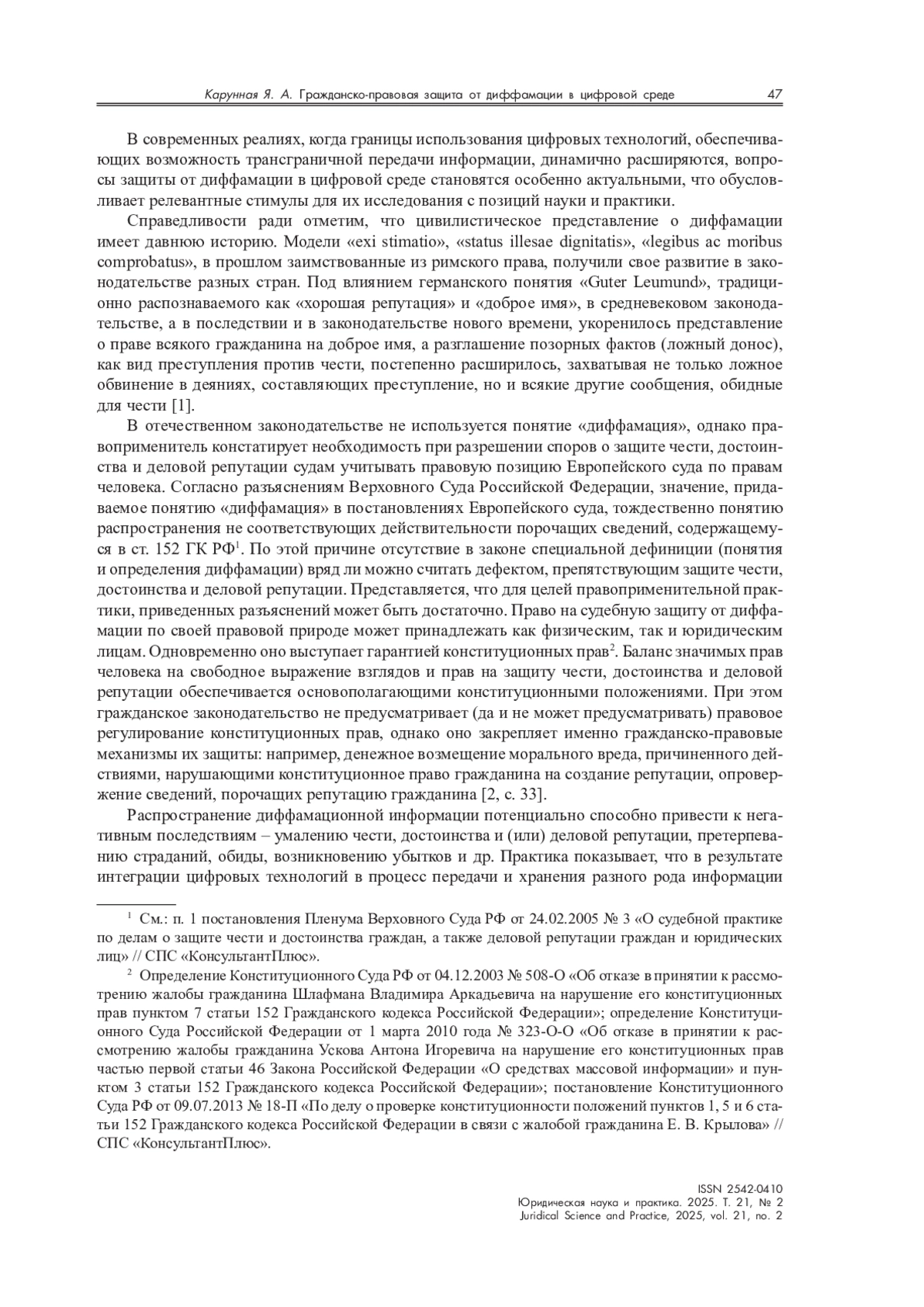 В работе рассмотрены практико-ориентированные проблемы гражданско-правовой защиты от диффамации, выделены основные правовые алгоритмы защиты от диффамации. На основе анализа нормативных положений и судебной практики автор приходит к выводу о том, что имеющиеся руководящие разъяснения по вопросам применения норм права не обеспечивают в действительности единообразия при их применении на практике. Используемая законодателем терминология характеризуется оценочностью, что создает предпосылки для расширительного и неправильного толкования положений закона, в результате чего успешность защиты от диффамации поставлена в зависимость не только от состояния правовой обеспеченности (нормативной базы), но и в значительной мере от качества правоприменения соответствующих норм права.