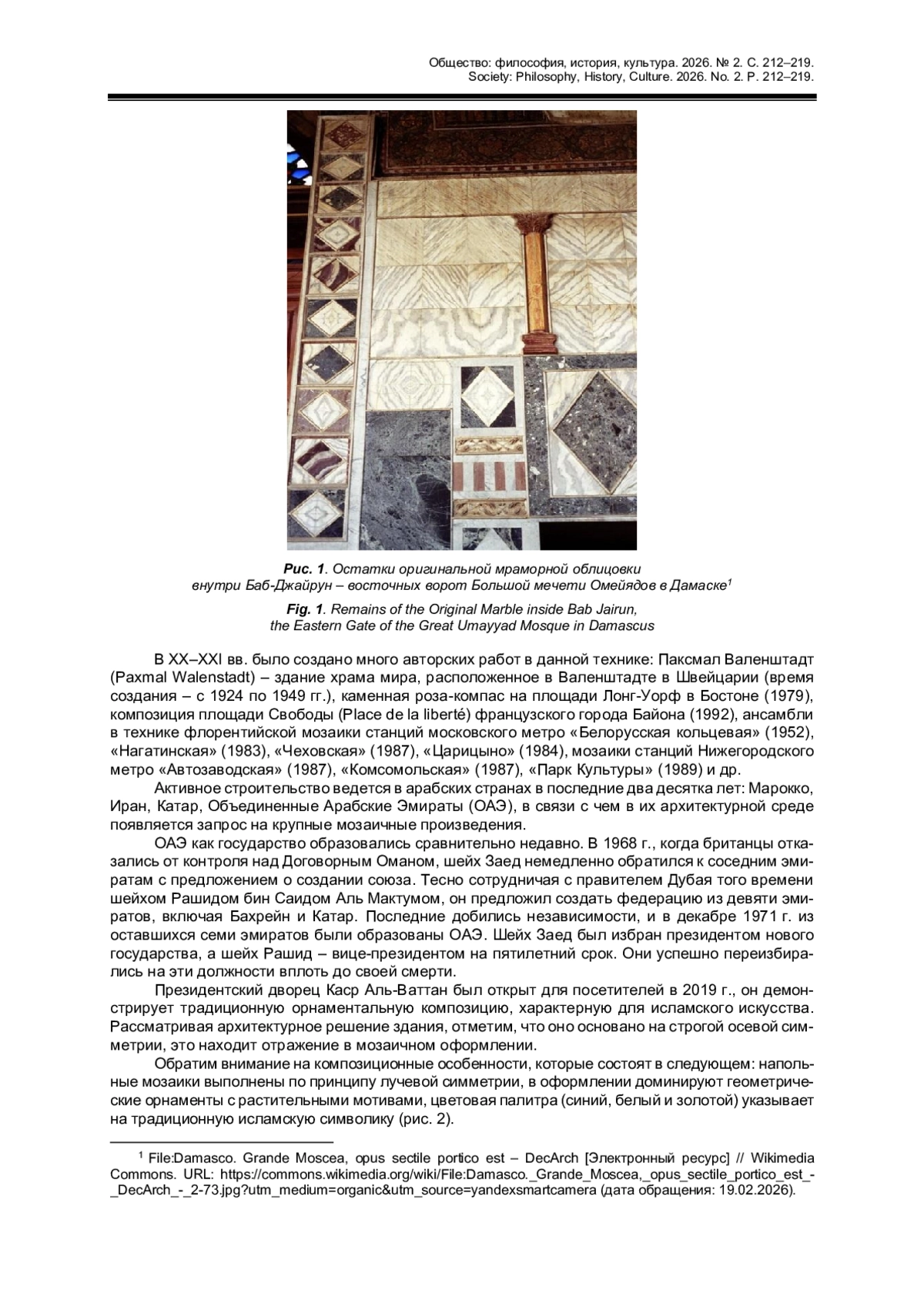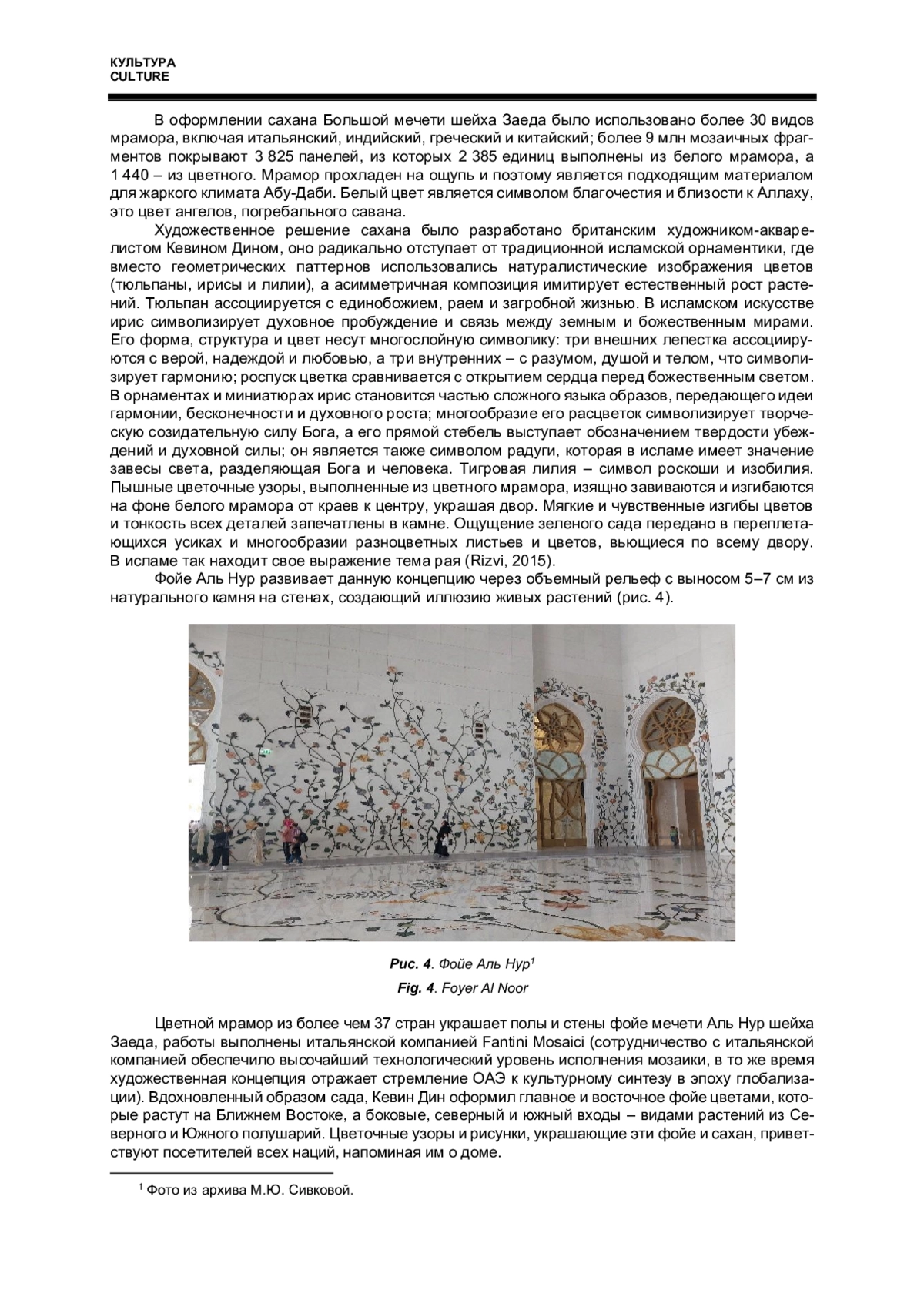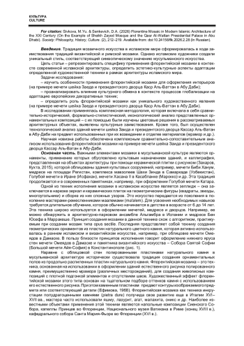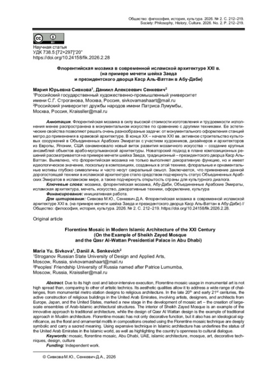 Флорентийская мозаика в силу высокой стоимости изготовления и трудоемкости исполнения менее распространена в монументальном искусстве по сравнению с другими техниками. Ее эстетические свойства позволяют решать очень разнообразные задачи: от монументального оформления станций метро до применения в храмовой архитектуре. В конце ХХ - начале ХХI вв. активное строительство культовых сооружений в Объединенных Арабских Эмиратах с участием художников, дизайнеров и архитекторов из Европы, Японии, США ознаменовало новый виток развития мозаичного искусства - создание крупных ансамблей объектов арабо-мусульманской архитектуры. Новаторский подход в плане композиционных решений рассматривается на примере мечети шейха Заеда, традиционный - президентского дворца Каср Аль-Ваттан. Выявлено, что флорентийская мозаика не только выполняет декоративную функцию, но и имеет идеологическое значение, поскольку в композициях, созданных в этой технике, флоральные и орнаментальные мотивы глубоко символичны и часто несут сакральный смысл.