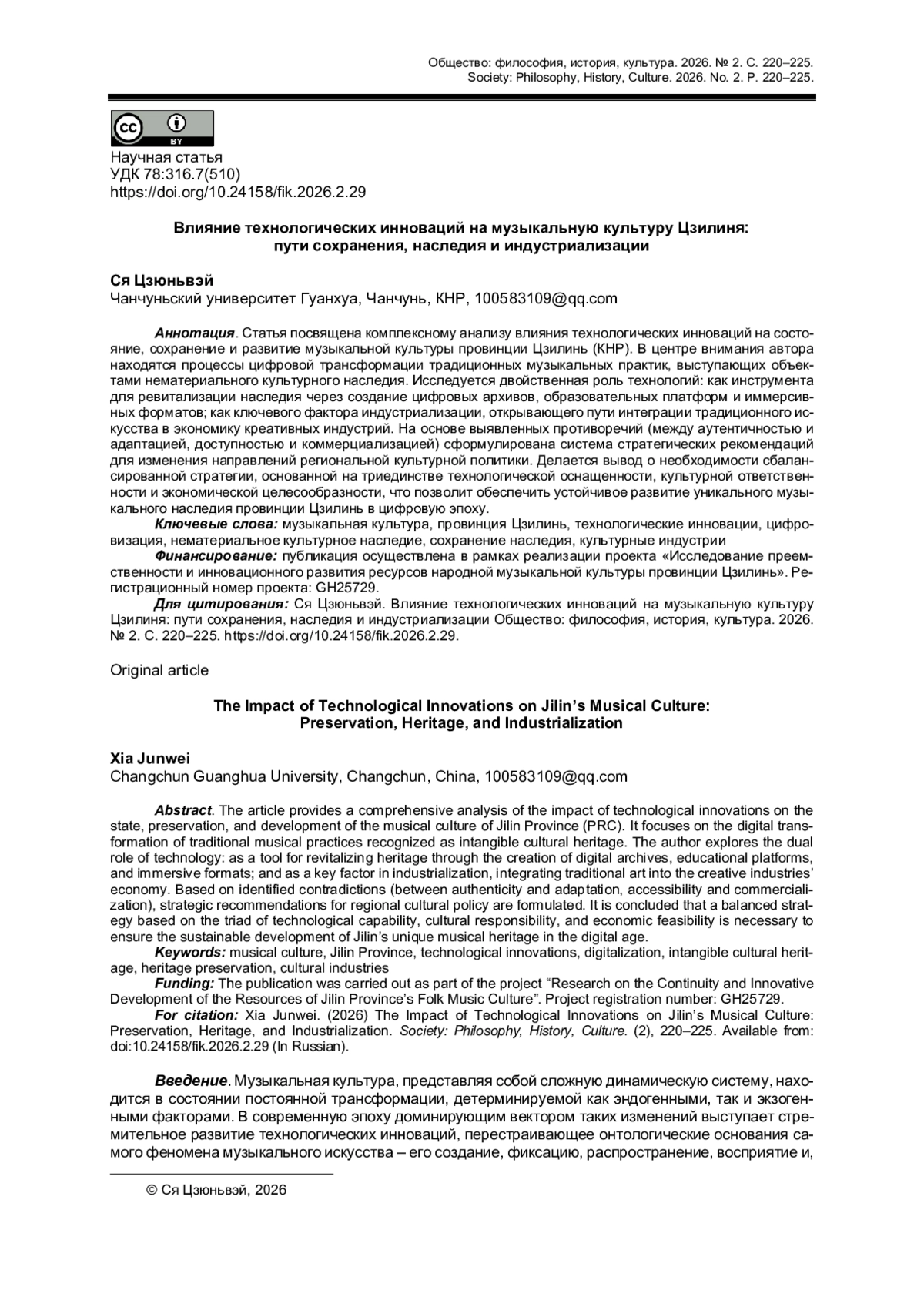 Статья посвящена комплексному анализу влияния технологических инноваций на состояние, сохранение и развитие музыкальной культуры провинции Цзилинь (КНР). В центре внимания автора находятся процессы цифровой трансформации традиционных музыкальных практик, выступающих объектами нематериального культурного наследия. Исследуется двойственная роль технологий: как инструмента для ревитализации наследия через создание цифровых архивов, образовательных платформ и иммерсивных форматов; как ключевого фактора индустриализации, открывающего пути интеграции традиционного искусства в экономику креативных индустрий. На основе выявленных противоречий (между аутентичностью и адаптацией, доступностью и коммерциализацией) сформулирована система стратегических рекомендаций для изменения направлений региональной культурной политики.