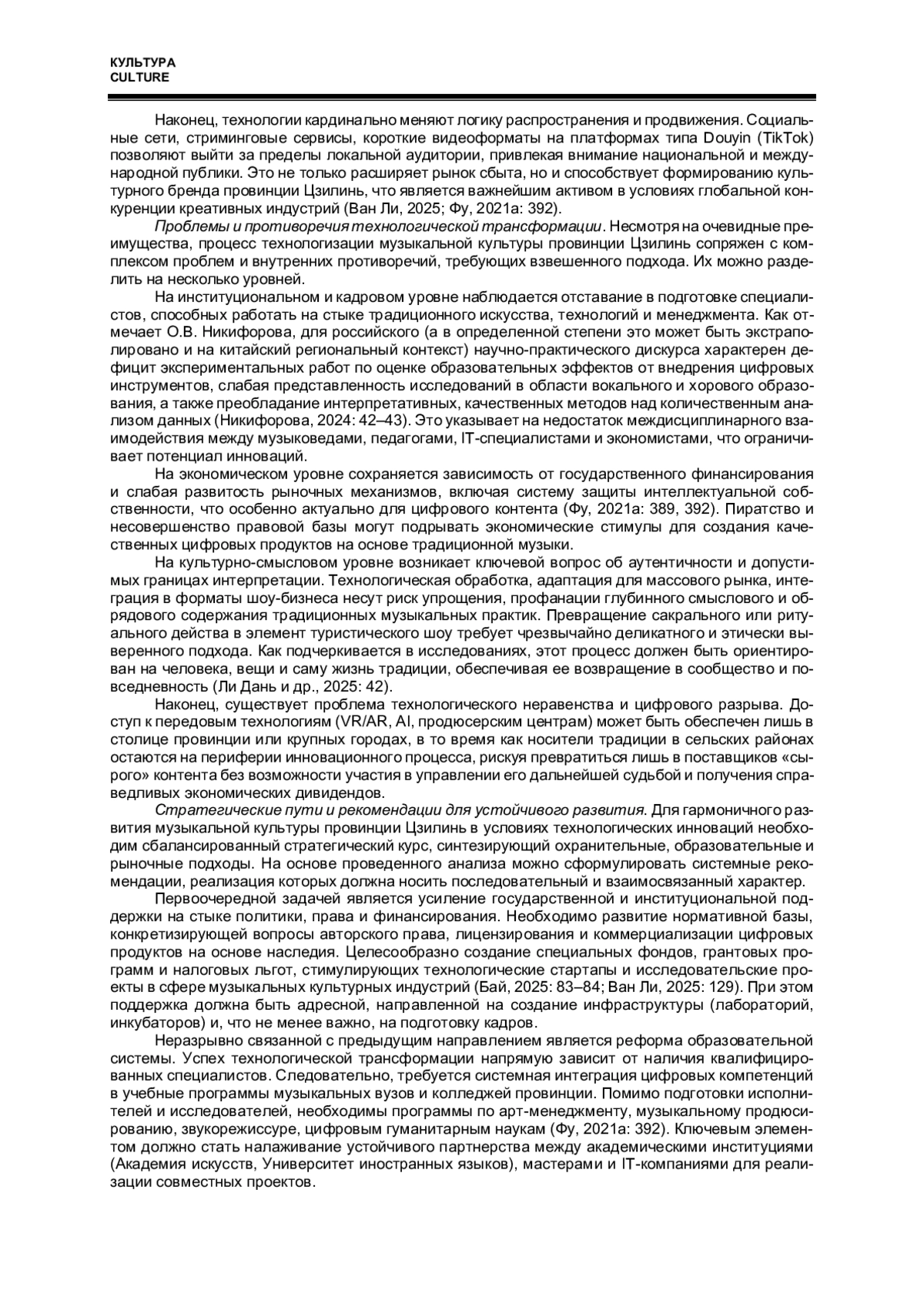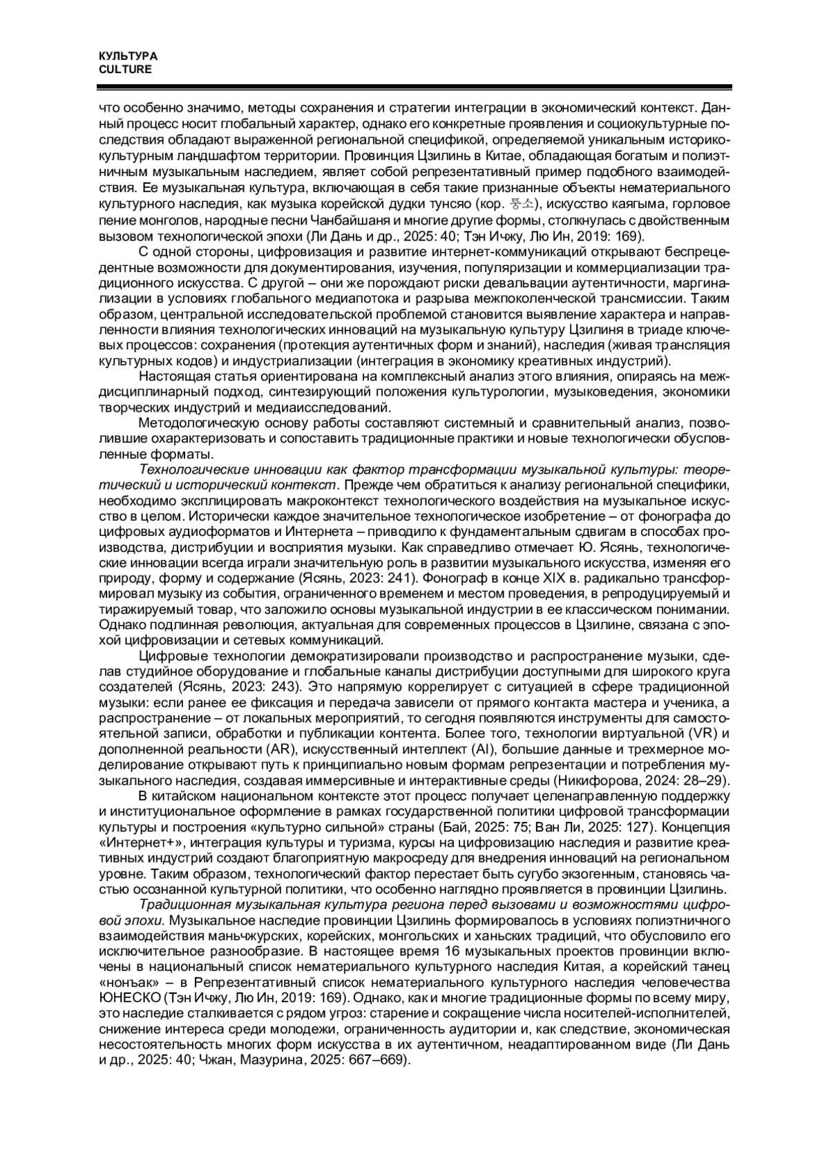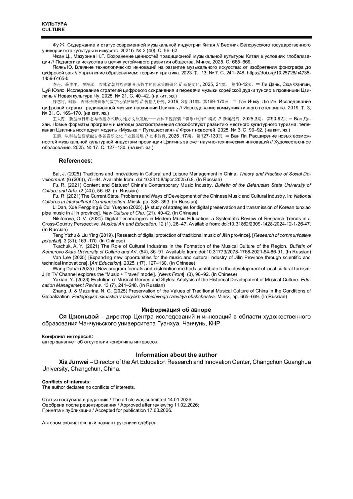 11. 王黎. 以科技创新赋能吉林省音乐文化产业新发展 // 艺术教育, 2025,17期。 第127-130页. Ван Ли. Расширение новых возможностей музыкальной культурной индустрии провинции Цзилинь за счет научно-технических инноваций // Художественное образование. 2025. № 17. С. 127-130. (на кит. яз.).