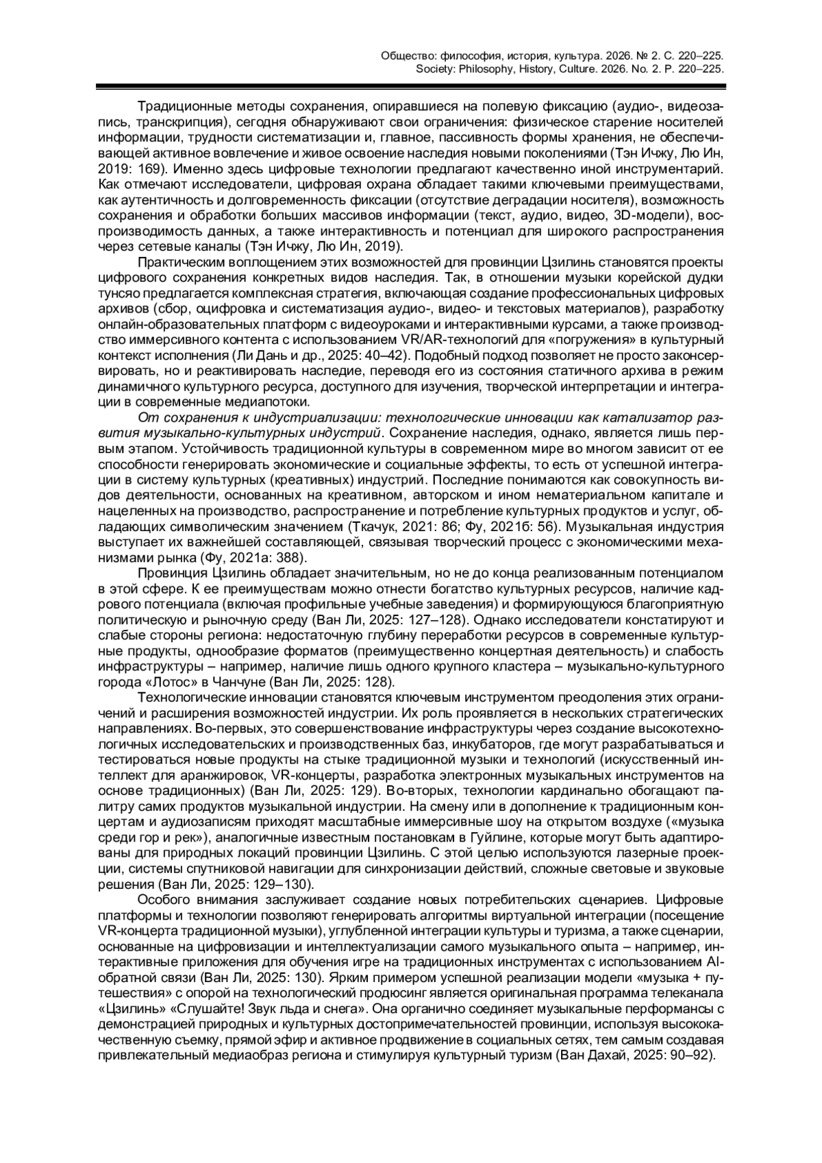 8. 李丹, 薛丰平, 崔悦瑶. 吉林省朝鲜族洞箫音乐数字化传承策略研究 // 新楚文化, 2025, 21期。 第40-42页. Ли Дань, Сюэ Фэнпин, Цуй Юэяо. Исследование стратегий цифрового сохранения и передачи музыки корейской дудки тунсяо в провинции Цзилинь // Новая культура Чу. 2025. № 21. С. 40-42. (на кит. яз.).