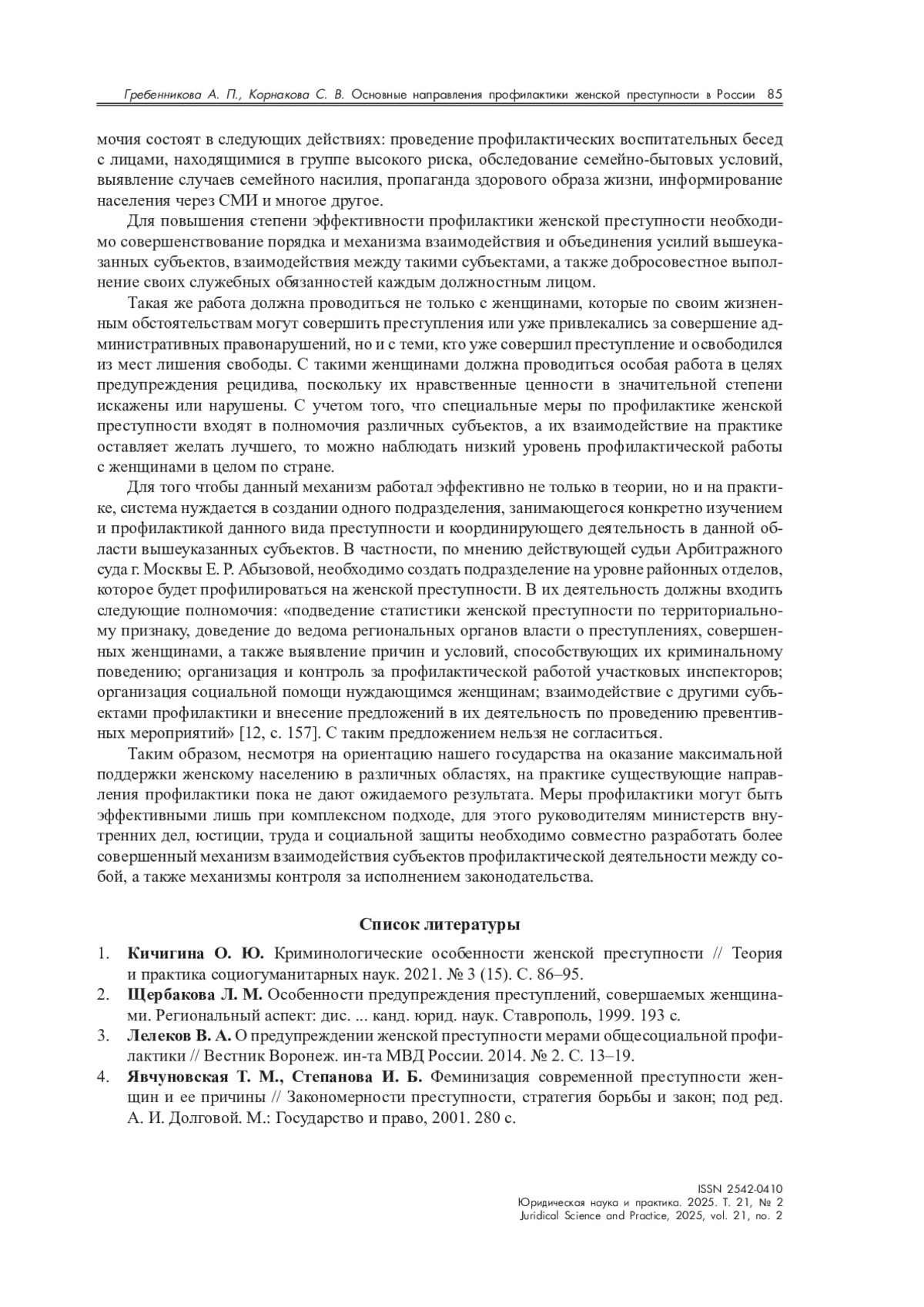 1. Кичигина О. Ю. Криминологические особенности женской преступности // Теория и практика социогуманитарных наук. 2021. № 3 (15). С. 86-95.