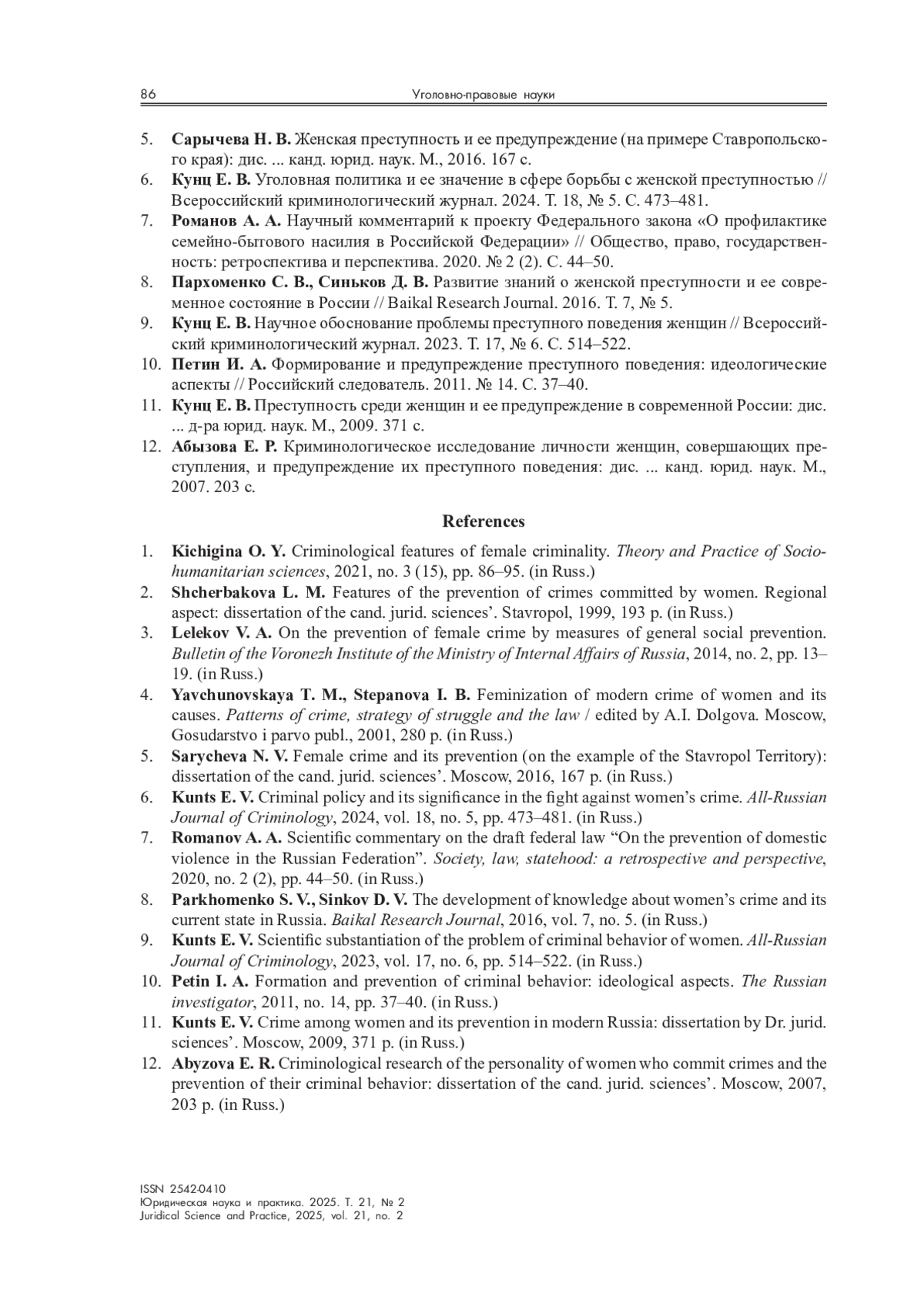 9. Кунц Е. В. Научное обоснование проблемы преступного поведения женщин // Всероссийский криминологический журнал. 2023. Т. 17, № 6. С. 514-522.
