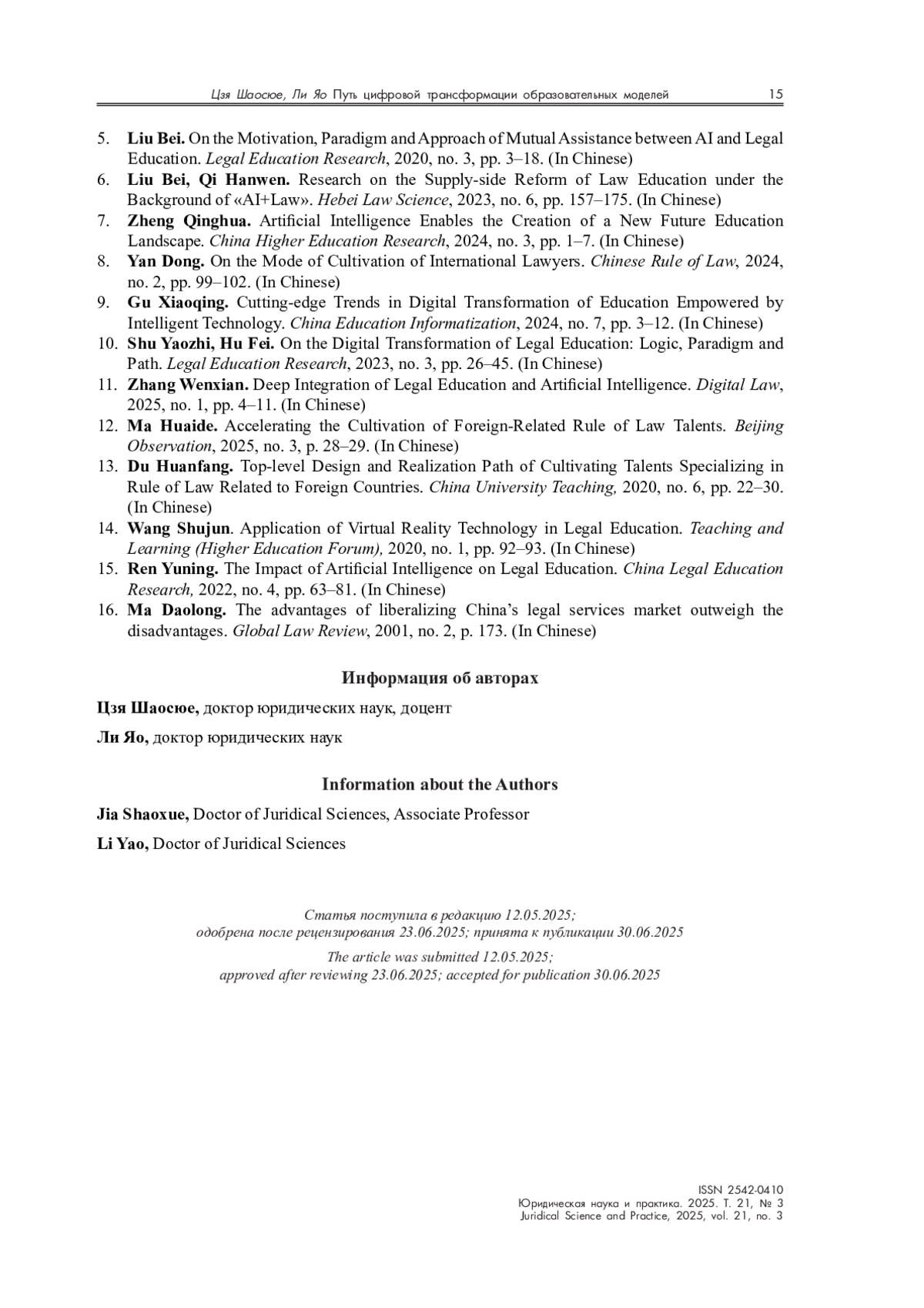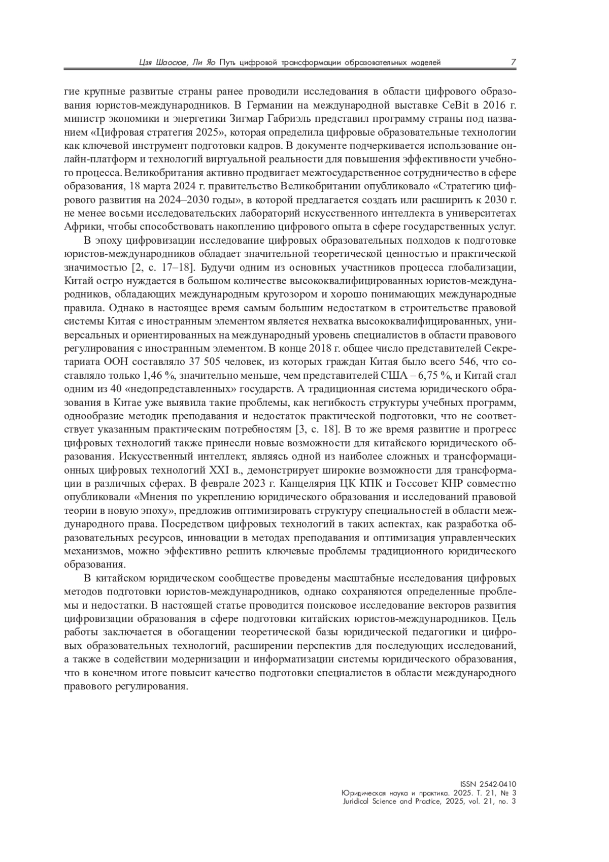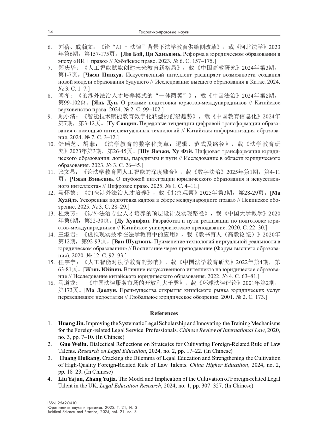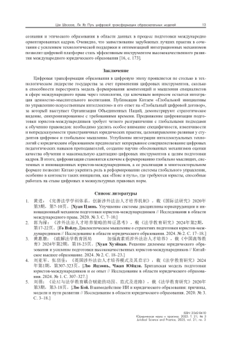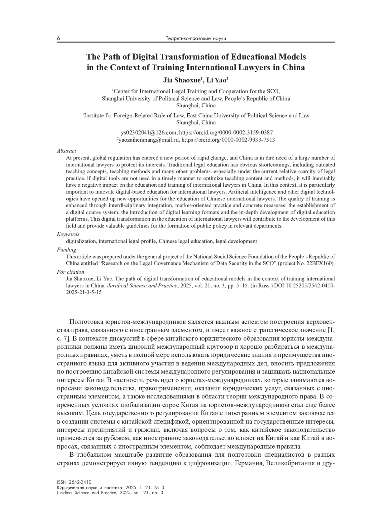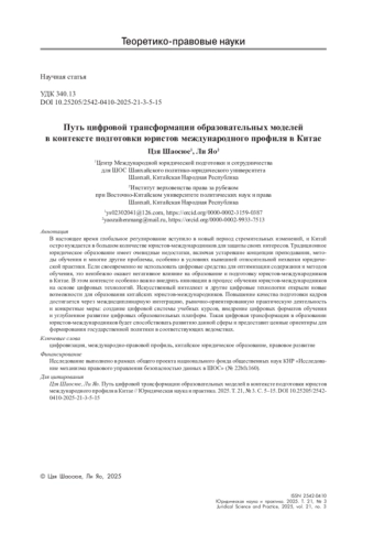 В настоящее время глобальное регулирование вступило в новый период стремительных изменений, и Китай остро нуждается в большом количестве юристов-международников для защиты своих интересов. Традиционное юридическое образование имеет очевидные недостатки, включая устаревшие концепции преподавания, методы обучения и многие другие проблемы, особенно в условиях нынешней относительной нехватки юридической практики. Если своевременно не использовать цифровые средства для оптимизации содержания и методов обучения, это неизбежно окажет негативное влияние на образование и подготовку юристов-международников в Китае. В этом контексте особенно важно внедрять инновации в процесс обучения юристов-международников на основе цифровых технологий. Искусственный интеллект и другие цифровые технологии открыли новые возможности для образования китайских юристов-международников. Повышение качества подготовки кадров достигается через междисциплинарную интеграцию, рыночно-ориентированную практическую деятельность и конкретные меры: создание цифровой системы учебных курсов, внедрение цифровых форматов обучения и углубленное развитие цифровых образовательных платформ. Такая цифровая трансформация в образовании юристов-международников будет способствовать развитию данной сферы и предоставит ценные ориентиры для формирования государственной политики в соответствующих ведомствах.