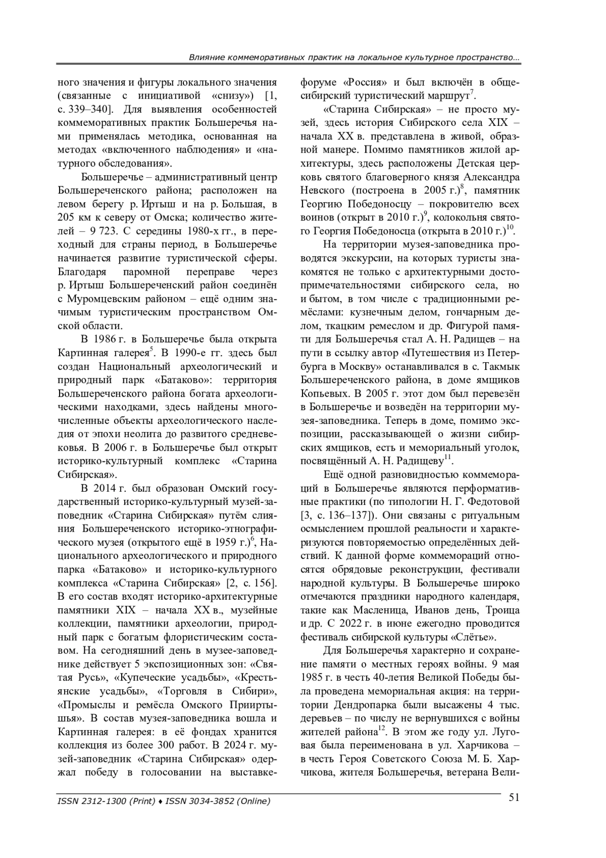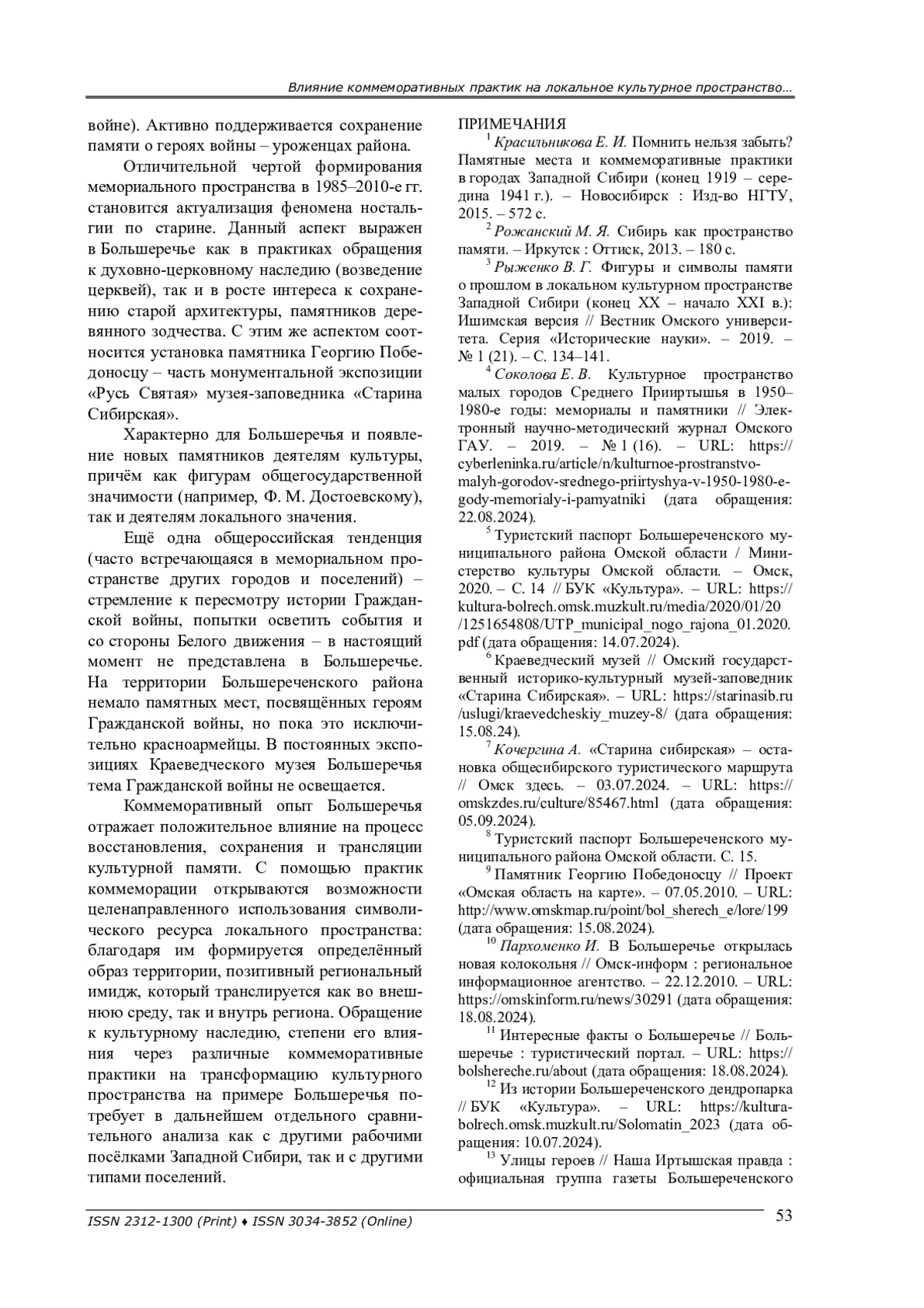 Проводится анализ практик коммеморации, характерных для рабочего посёлка Большеречье Омской области в период с 1985 г. по настоящее время. Рассматриваются такие варианты коммемораций, как установка или реконструкция памятников, мемориальных досок, скульптур; переименование улиц; деятельность музеев и музейных комплексов и др. Полученные результаты показали значимость коммеморативных практик, их влияние на локальное культурное пространство Большеречья: благодаря обращению к культурному наследию формируется определённый образ территории (локальный бренд).