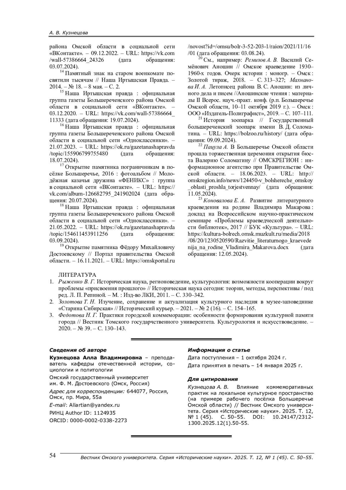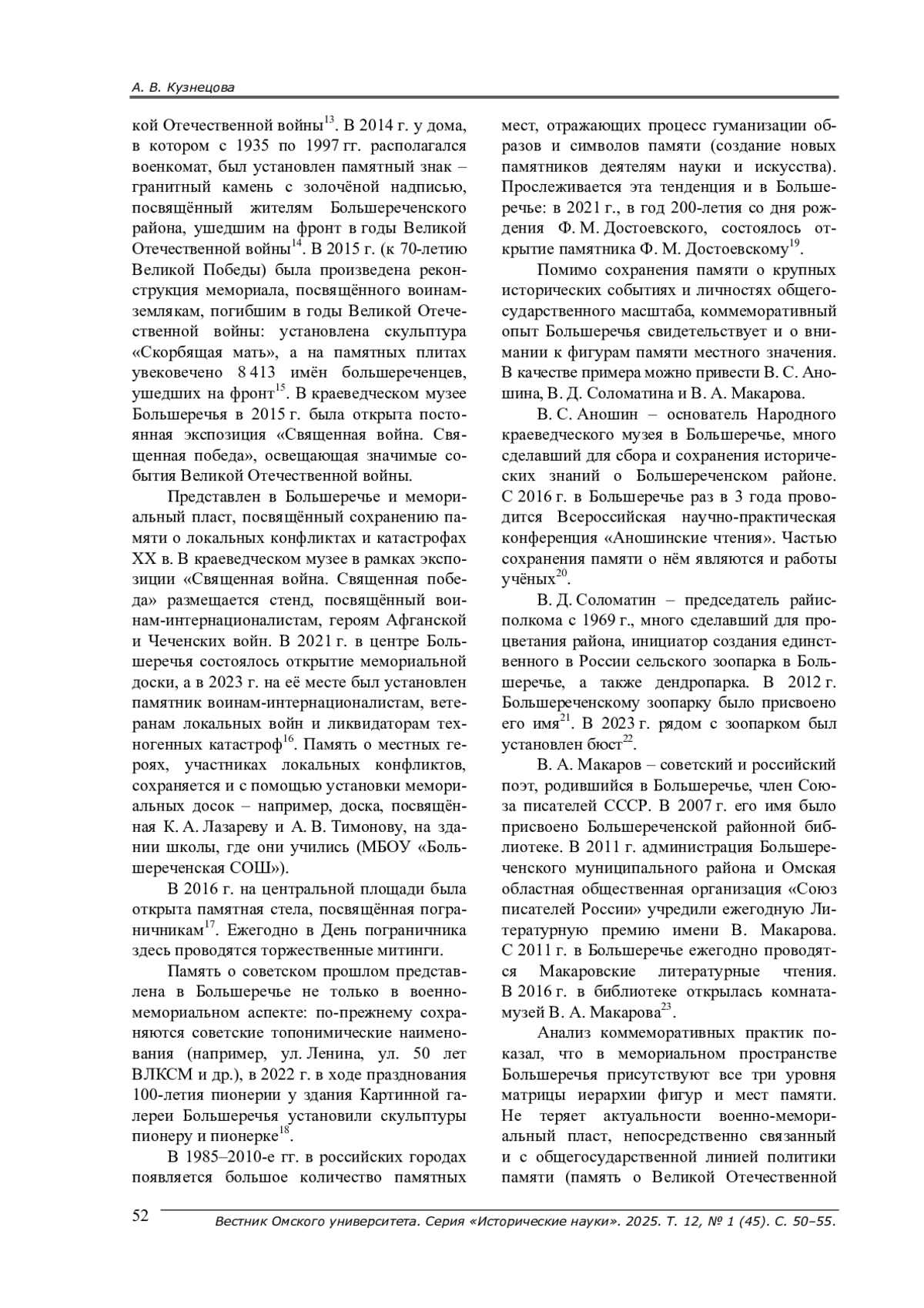 3. Федотова Н. Г. Практики городской коммеморации: особенности формирования культурной памяти города // Вестник Томского государчственного университета. Культурология и искусствоведение. - 2020. - № 39. - С. 130-143.