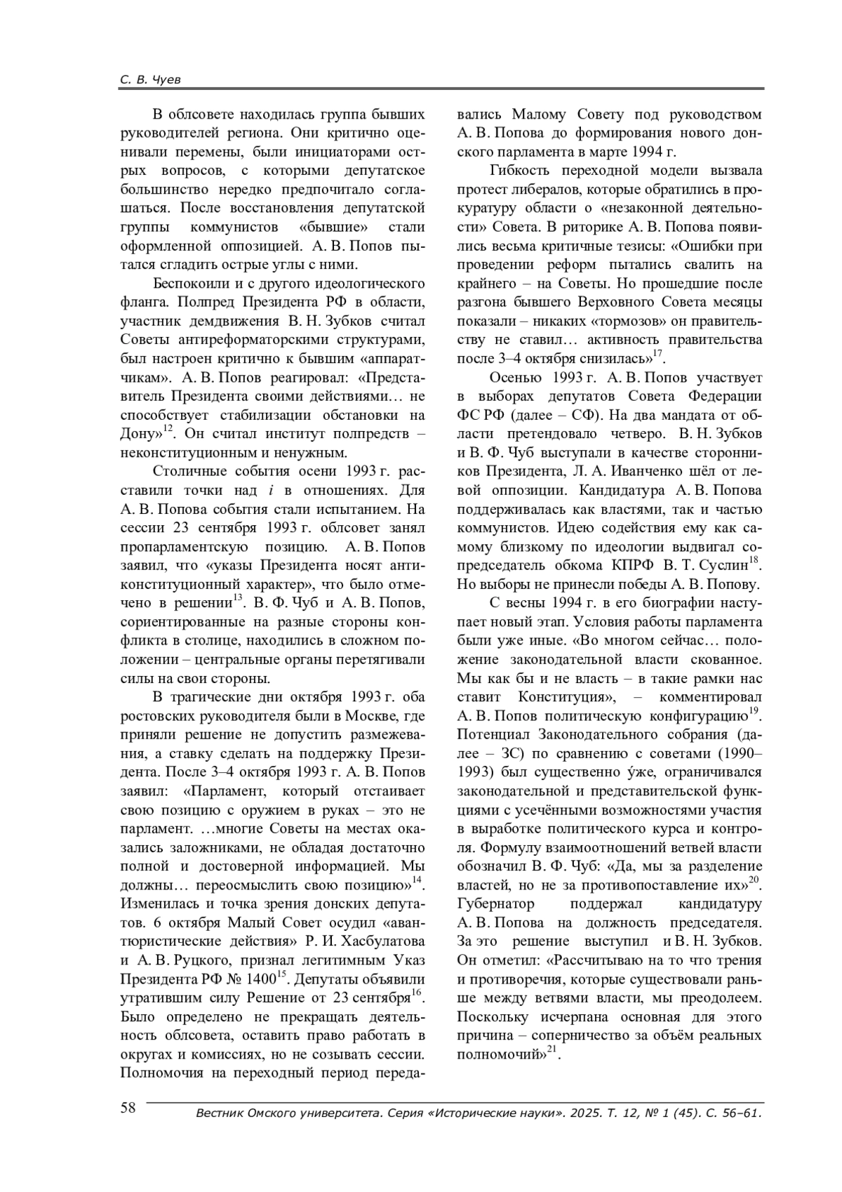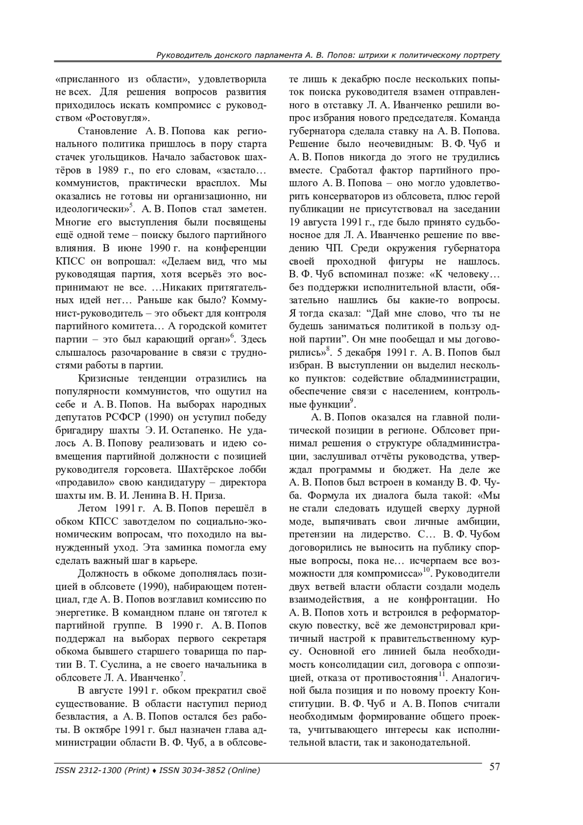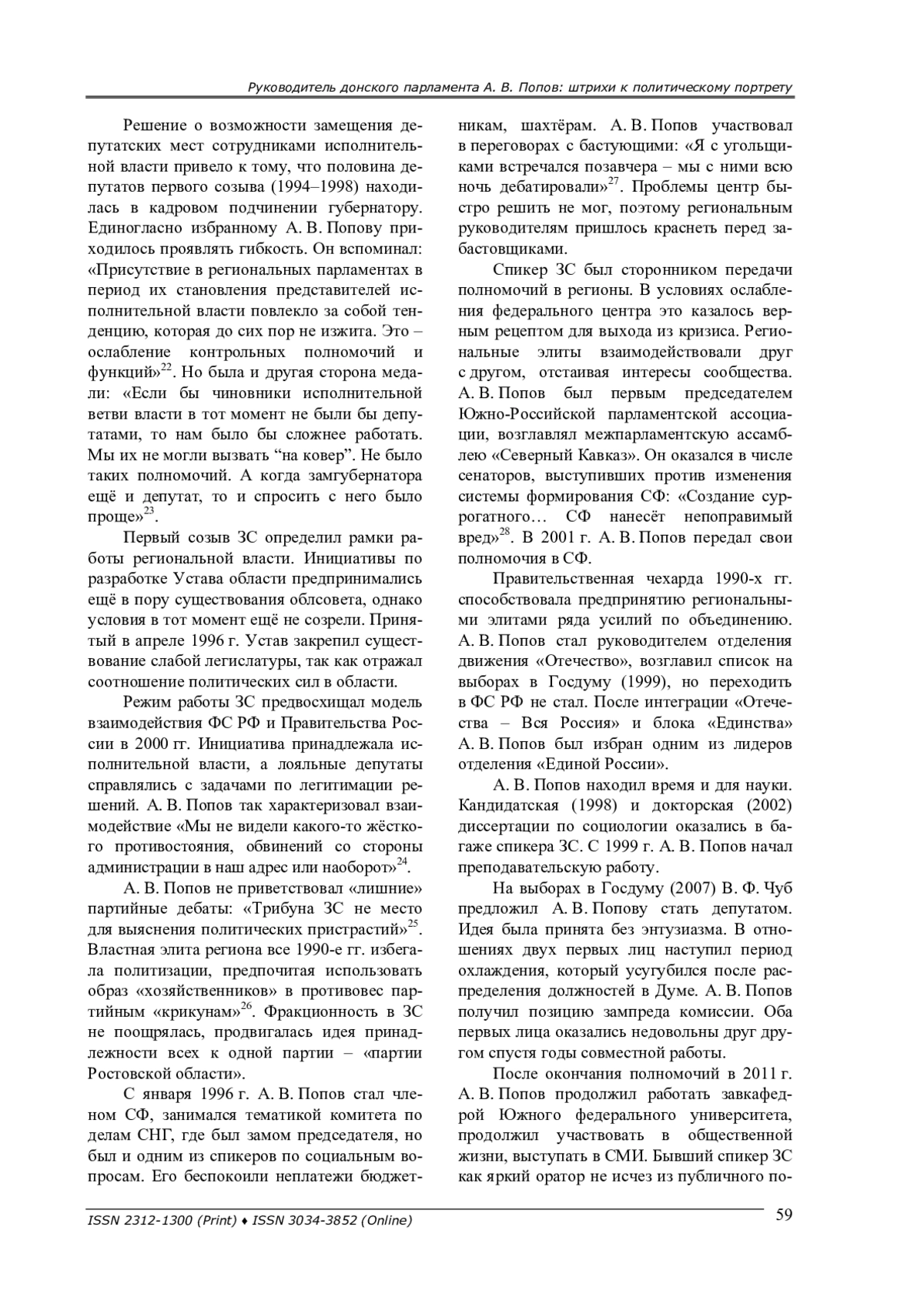 Очерк о деятельности ростовского политика А. В. Попова. Вехи его биографии попали на период социально-экономической и политической трансформации. А. В. Попову удалось внести существенный вклад в становление донского парламентаризма в 1990-2000-е гг.