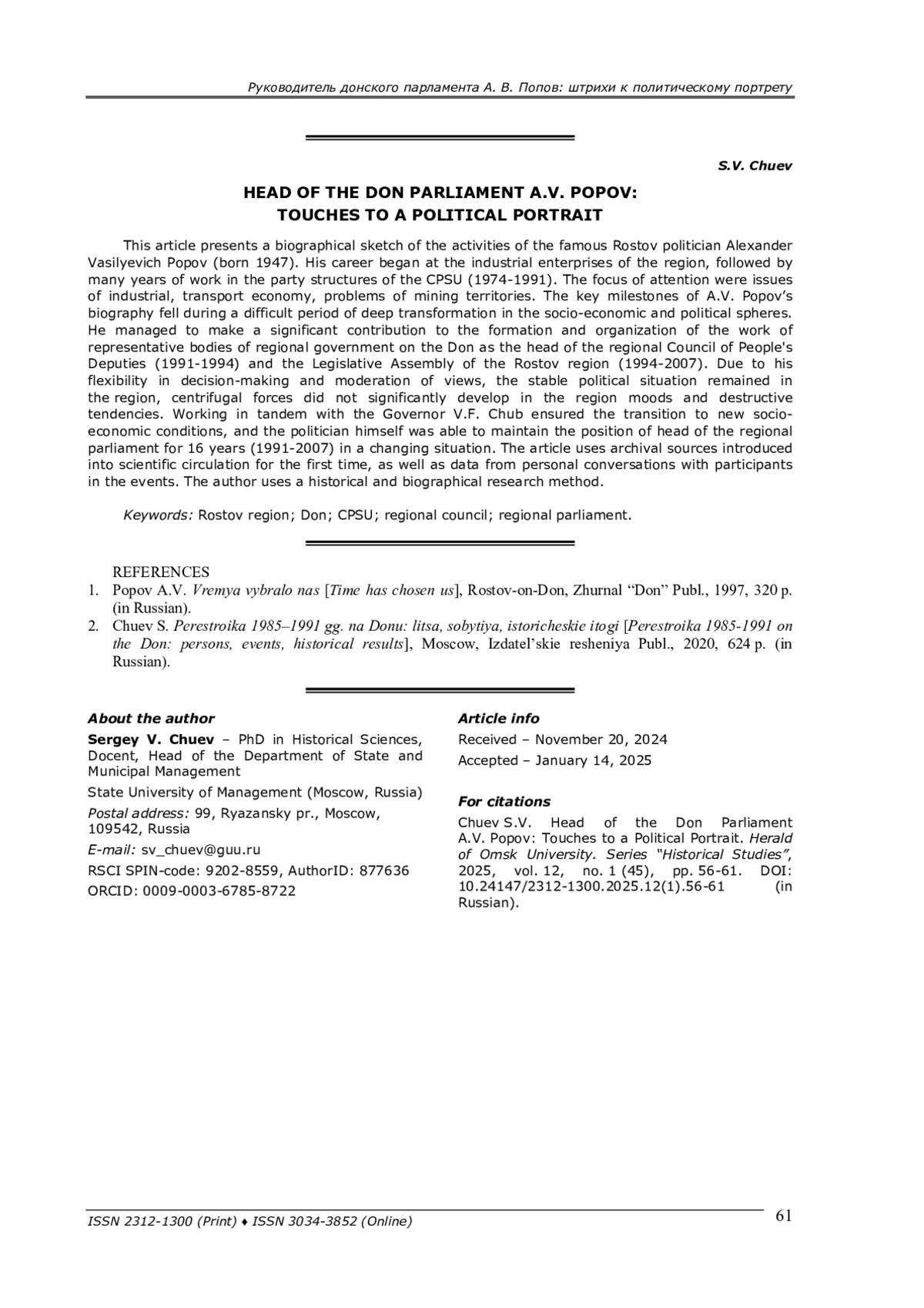 Изучение множества сюжетов современной истории только становится предметом внимания учёных. В статье ставится задача создания очерка о жизни Александра Васильевича Попова – одной из центральных фигур современной истории Дона. Тематики касались в ряде изданий. Автором использованы архивные документы (Государственный архив Ростовской области, Центр документации новейшей истории Ростовской области), материалы СМИ, воспоминания участников событий2, мемуары героя публикации [1] и его интервью. Используется историко-биографический метод. Материалы могут быть использованы в краеведческой деятельности, учебном процессе.