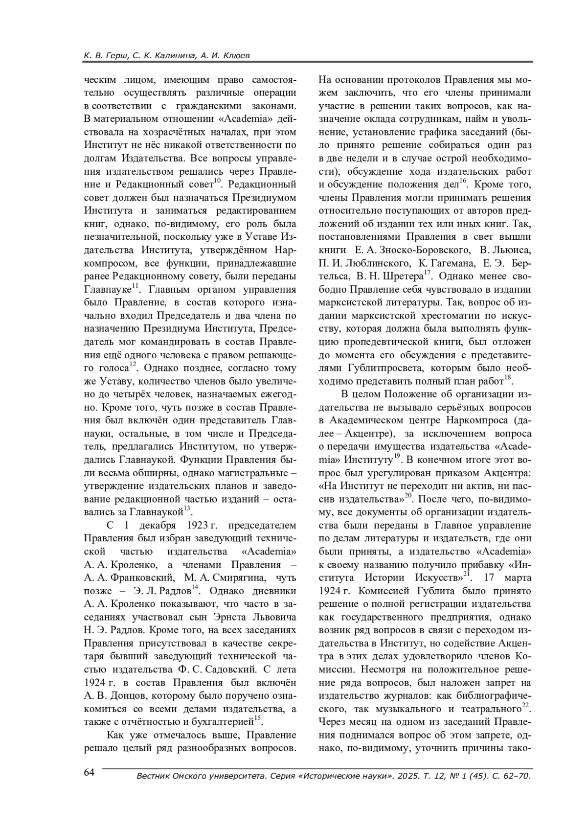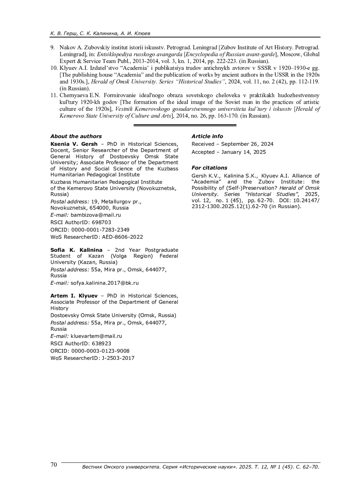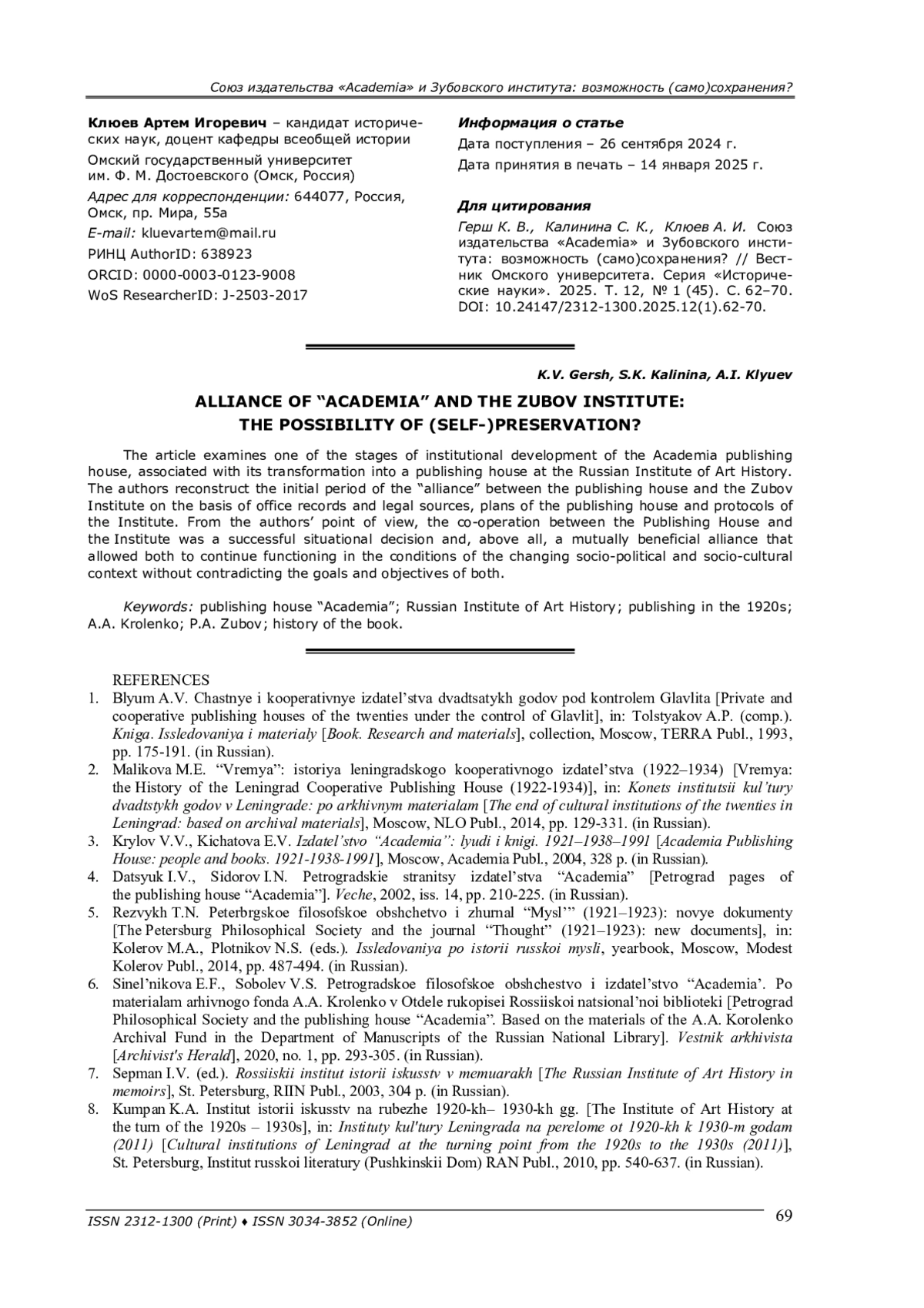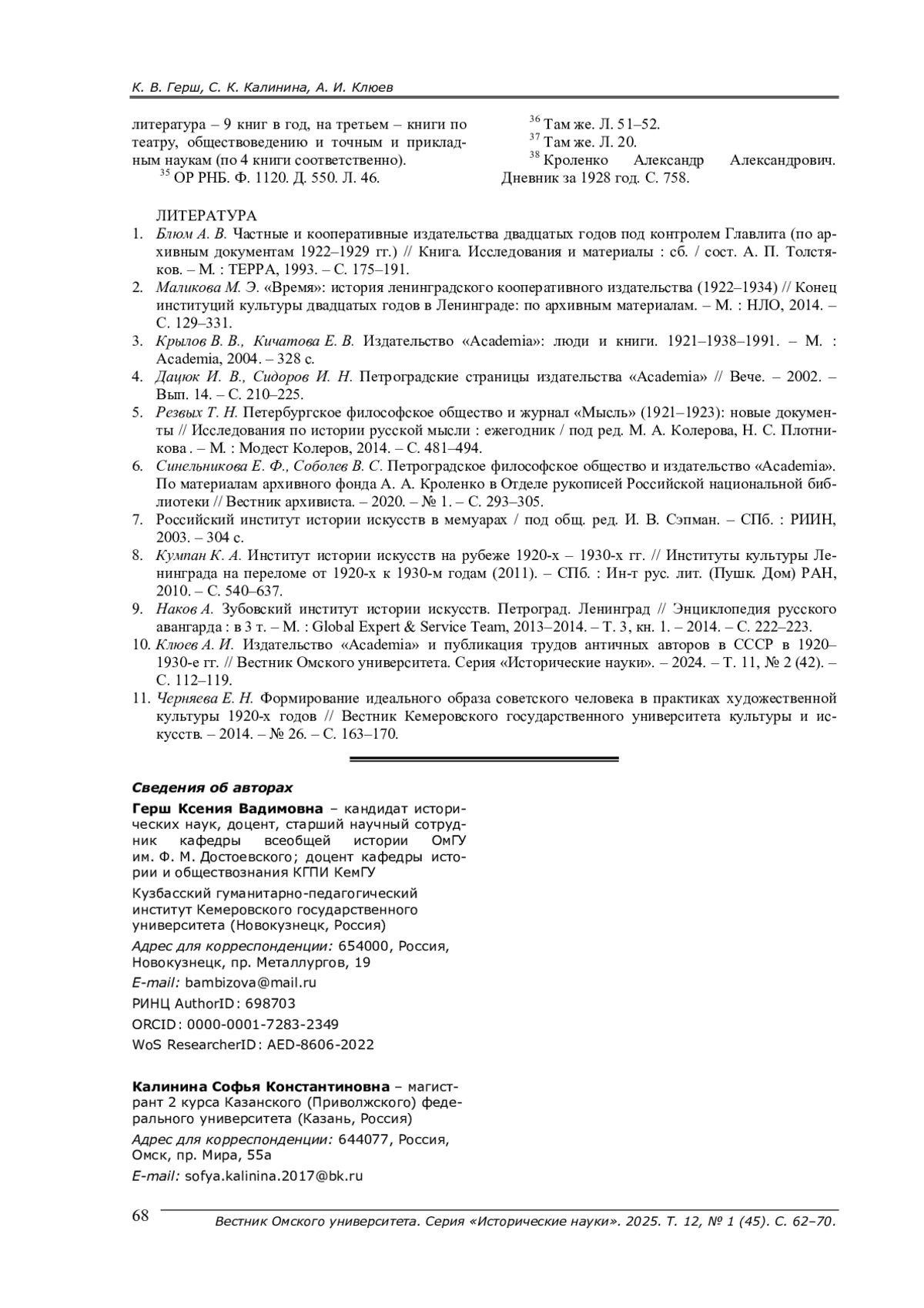 10. Клюев А. И. Издательство “Academia” и публикация трудов античных авторов в СССР в 1920-1930-е гг. // Вестник Омского университета. Серия “Исторические науки”. - 2024. - Т. 11, № 2 (42). - С. 112-119. EDN: NWIZOQ