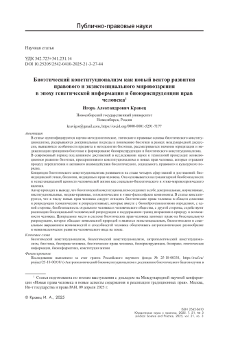 В статье идентифицируются научно-методологические, этические и правовые основы биоэтического конституционализма, раскрываются доктринальные подходы к пониманию биоэтики в рамках международной дискуссии, выявляются особенности предмета и методологии биоэтики, рассматривается значение юридизации и медикализации принципов биоэтики и формирование биоюриспруденции и биоэтического конституционализма. В современный период под влиянием достижений в исследовании науки и технологий происходит коэволюционное развитие биоэтики, прескриптивного конституционализма и новых прав человека, которые отражают процесс переплетения и активного взаимодействия биологического, социального, правового и культурного порядка. Концепция биоэтического конституционализма развивается на стыке четырех сфер знаний и достижений: биомедицинской этики, биологии, медицины и прав человека. Она основывается на гуманитарной биобезопасности и экзистенциальной ценности человеческой жизни как социально-биологического и этико-мировоззренческого явления. Автор приходит к выводу, что биоэтический конституционализм соединяет в себе доктринальные, нормативные, институциональные, медико-правовые, технологические и этико-философские компоненты. В статье констатируется, что к числу новых прав человека следует относить биоэтические права человека в области соматики и репродукции (соматические и репродуктивные), которые вместе с бионейротехнологиями определяют, с одной стороны, биобезопасность отдельного человека и человеческого общества, с другой стороны, содействуют реализации биосоциальной человеческой репродукции и поддержанию границ вторжения в природу и возможности человека. Центральное место в системе биоэтических прав человека занимает право на биосоциальную репродукцию, которое обладает комплексной природой и является экзистенциальным, биологическим и социальным выражением возможностей и способностей человека обеспечивать антропологическое разнообразие и межпоколенческое развитие человеческого вида на земле.