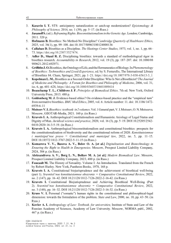 14. Кравец И. А. Антропологический биоконституционализм и конституционная биоэтика: перспективы конституционализации биоразнообразия и конституционная реформа 2020 года // Конституционное и муниципальное право. 2022. № 5. С. 11-15. https://doi.org/10.18572/1812-3767-2022-5-11-15.