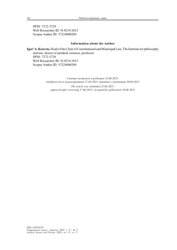 33. Кравец И. А. Бионейроконституционализм - стратегическая парадигма российской и меж дународной конституционной юриспруденции // Современный российский конституционализм: к 85-летию со дня рождения академика О. Е. Кутафина. М.: Проспект, 2023. С. 193-201.