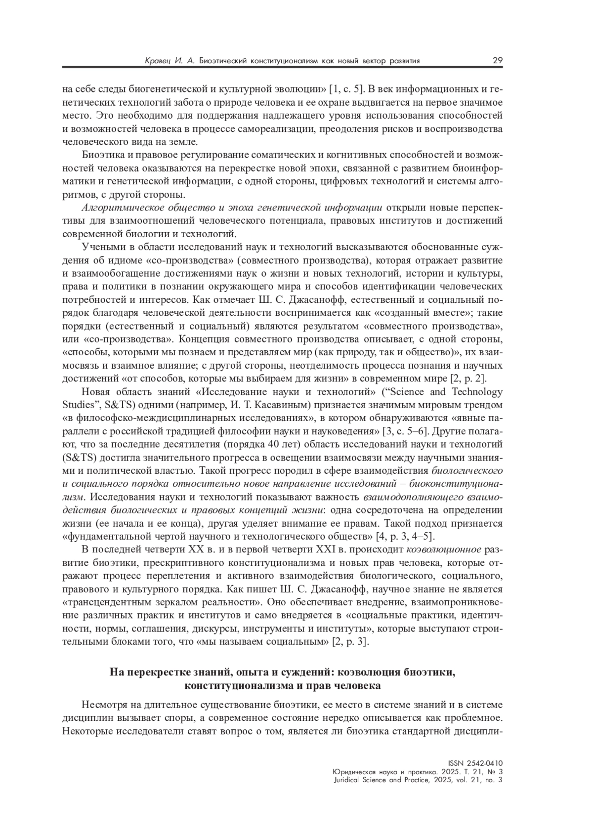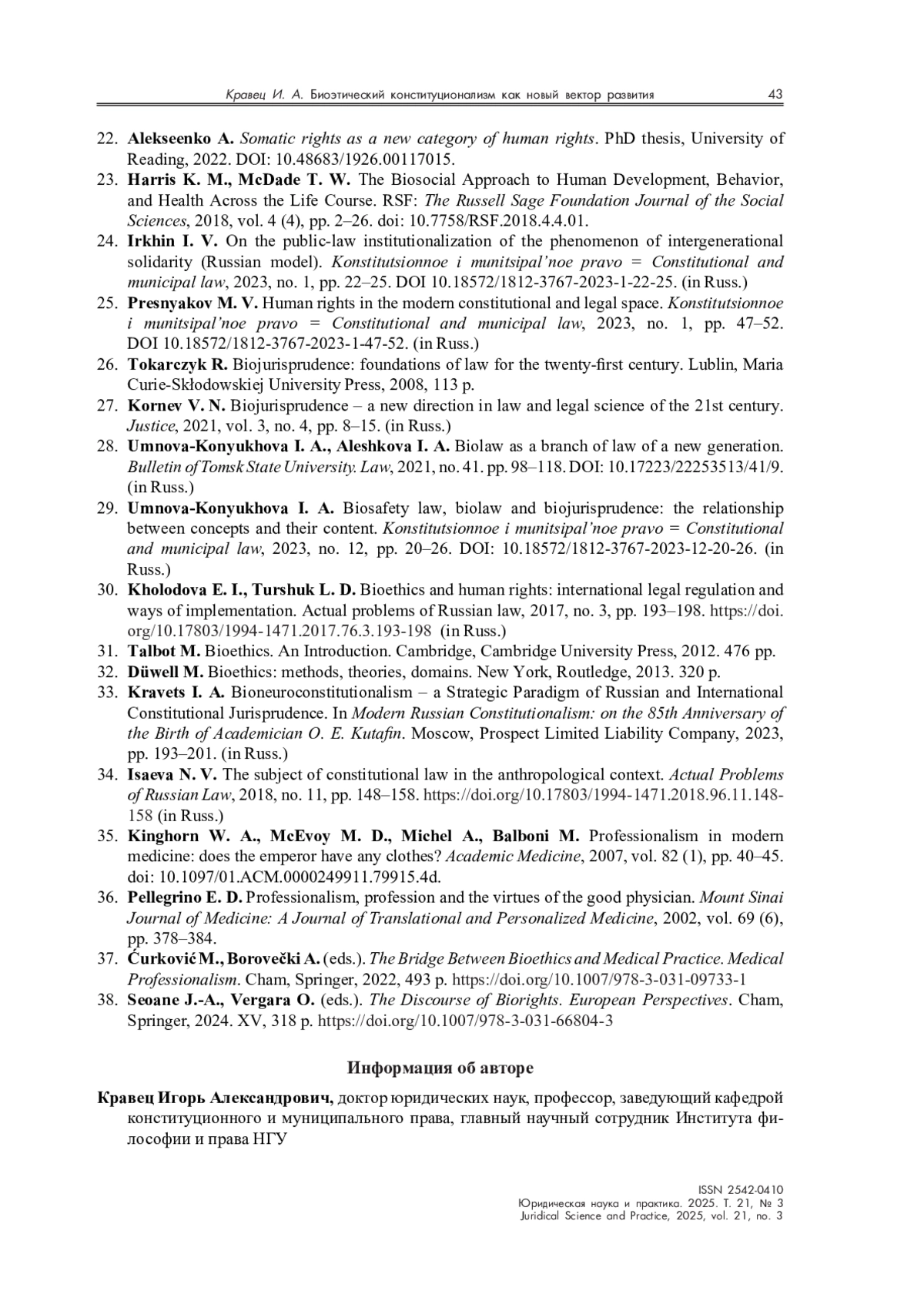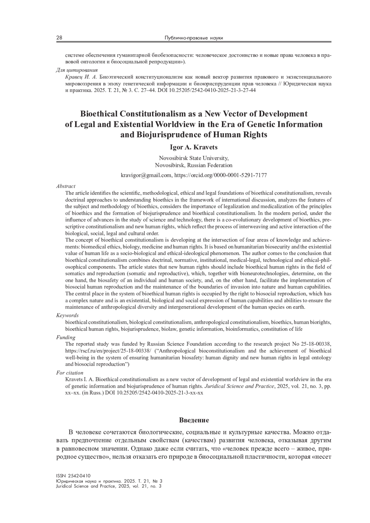 27. Корнев В. Н. Биоюриспруденция - новое направление в праве и юридической науке XXI века // Правосудие. 2021. Т. 3, № 4. С. 8-15.