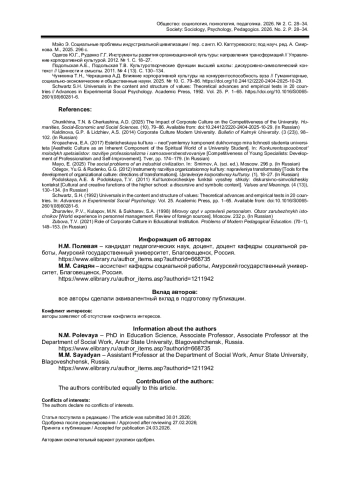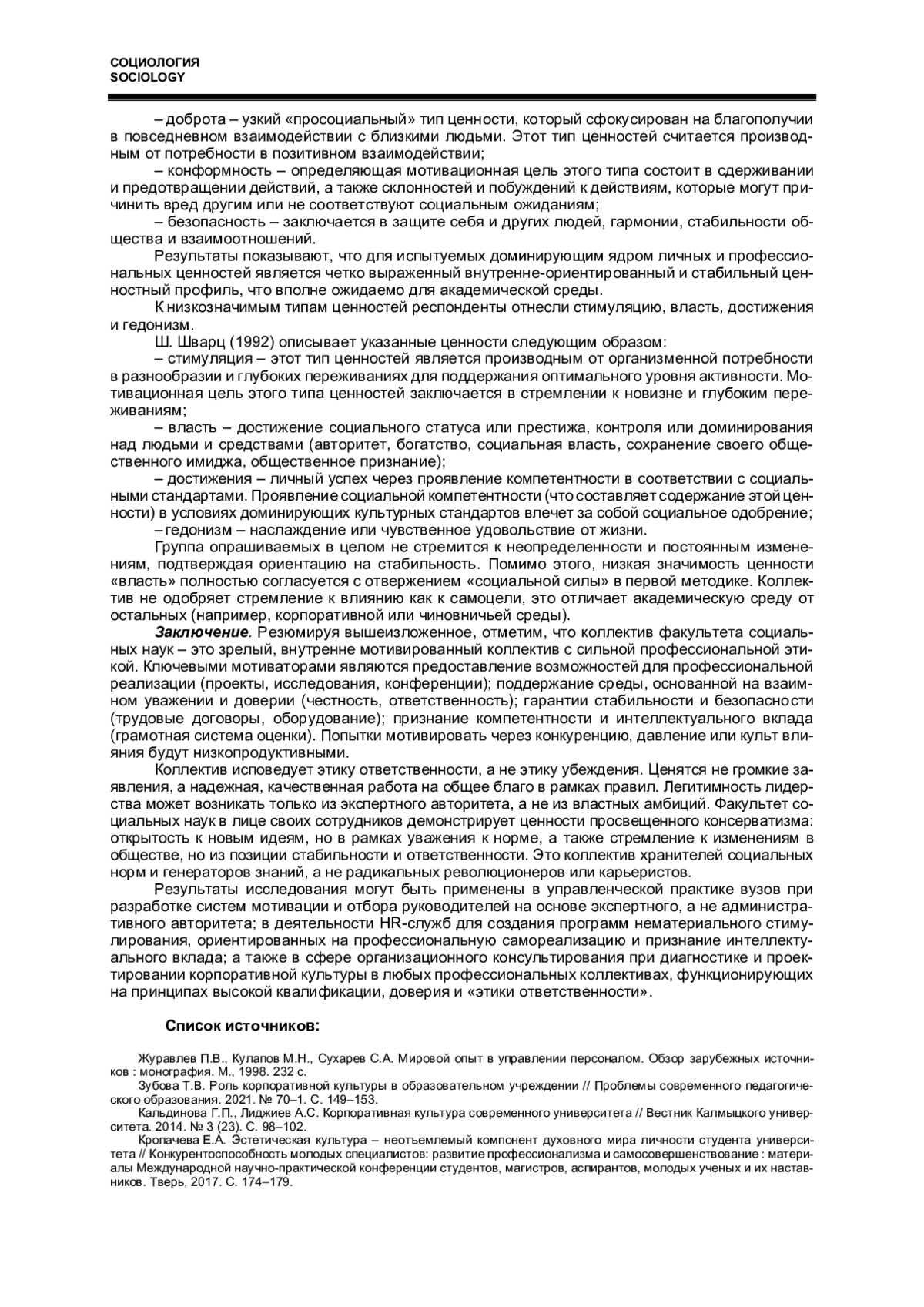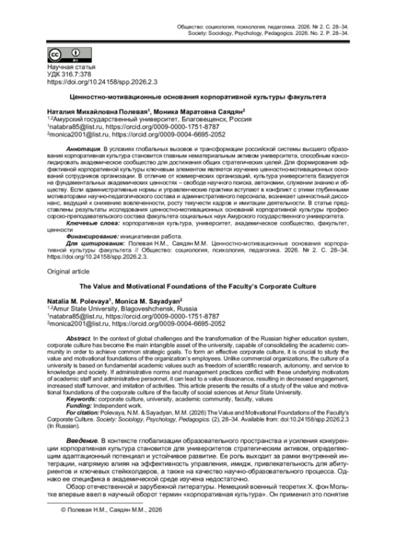 В условиях глобальных вызовов и трансформации российской системы высшего образования корпоративная культура становится главным нематериальным активом университета, способным консолидировать академическое сообщество для достижения общих стратегических целей. Для формирования эффективной корпоративной культуры ключевым элементом является изучение ценностно-мотивационных оснований сотрудников организации. В отличие от коммерческих организаций, культура университета базируется на фундаментальных академических ценностях - свободе научного поиска, автономии, служении знанию и обществу. Если административные нормы и управленческие практики вступают в конфликт с этими глубинными мотиваторами научно-педагогического состава и административного персонала, возникает ценностный диссонанс, ведущий к снижению вовлеченности, росту текучести кадров и имитации деятельности. В статье представлены результаты исследования ценностно-мотивационных оснований корпоративной культуры профессорско-преподавательского состава факультета социальных наук Амурского государственного университета.