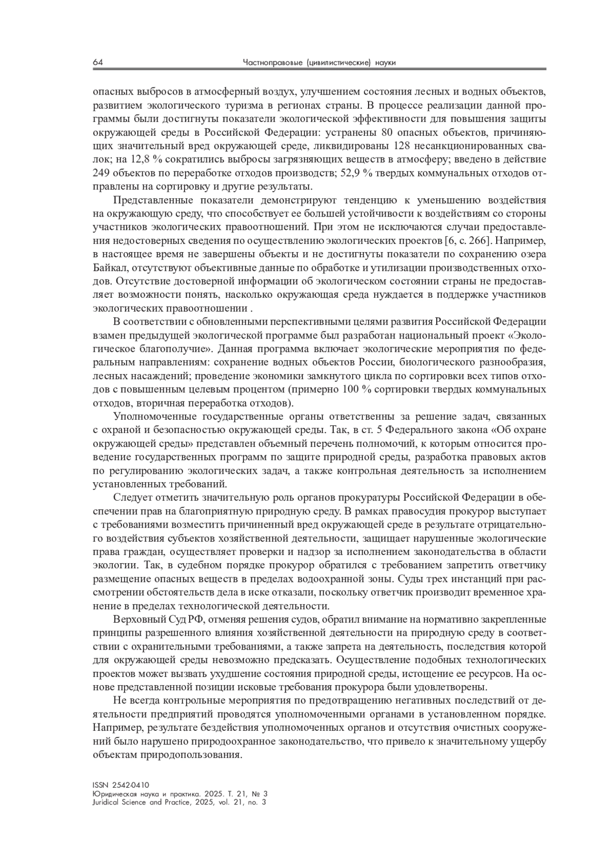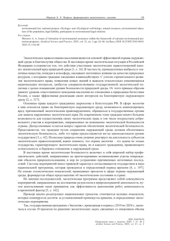 Исследование посвящено анализу формирования экологического сознания субъектов экологических правоотношений в рамках государственных и региональных программ охраны окружающей среды в Российской Федерации. На основе проведенного анализа экологической ситуации было установлено, что действия участников экологических правоотношений не только препятствуют достижению стратегических целей России, но и создают угрозу для благополучия и качества жизни. Реализация национального проекта «Экология» в период с 2019 по 2024 г. внесла значительный вклад в улучшение экологической обстановки. Однако, несмотря на достигнутые показатели, работа в этом направлении должна быть продолжена для достижения еще более значительных результатов.