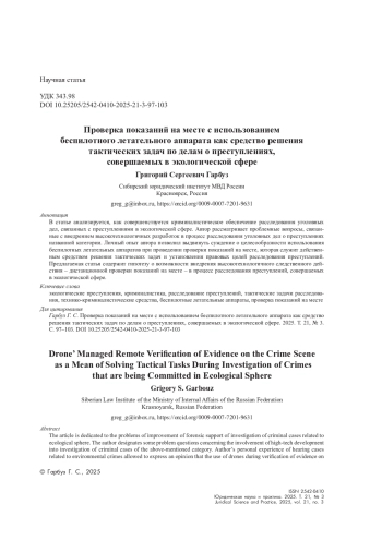 В статье анализируется, как совершенствуется криминалистическое обеспечение расследования уголовных дел, связанных с преступлениями в экологической сфере. Автор рассматривает проблемные вопросы, связанные с внедрением высокотехнологичных разработок в процесс расследования уголовных дел о преступлениях названной категории. Личный опыт автора позволил выдвинуть суждение о целесообразности использования беспилотных летательных аппаратов при проведении проверки показаний на месте, которая служит действенным средством решения тактических задач и установления правовых целей расследования преступлений. Предлагаемая статья содержит гипотезу о возможности внедрения высокотехнологичного следственного действия – дистанционной проверки показаний на месте – в процесс расследования преступлений, совершаемых в экологической сфере.