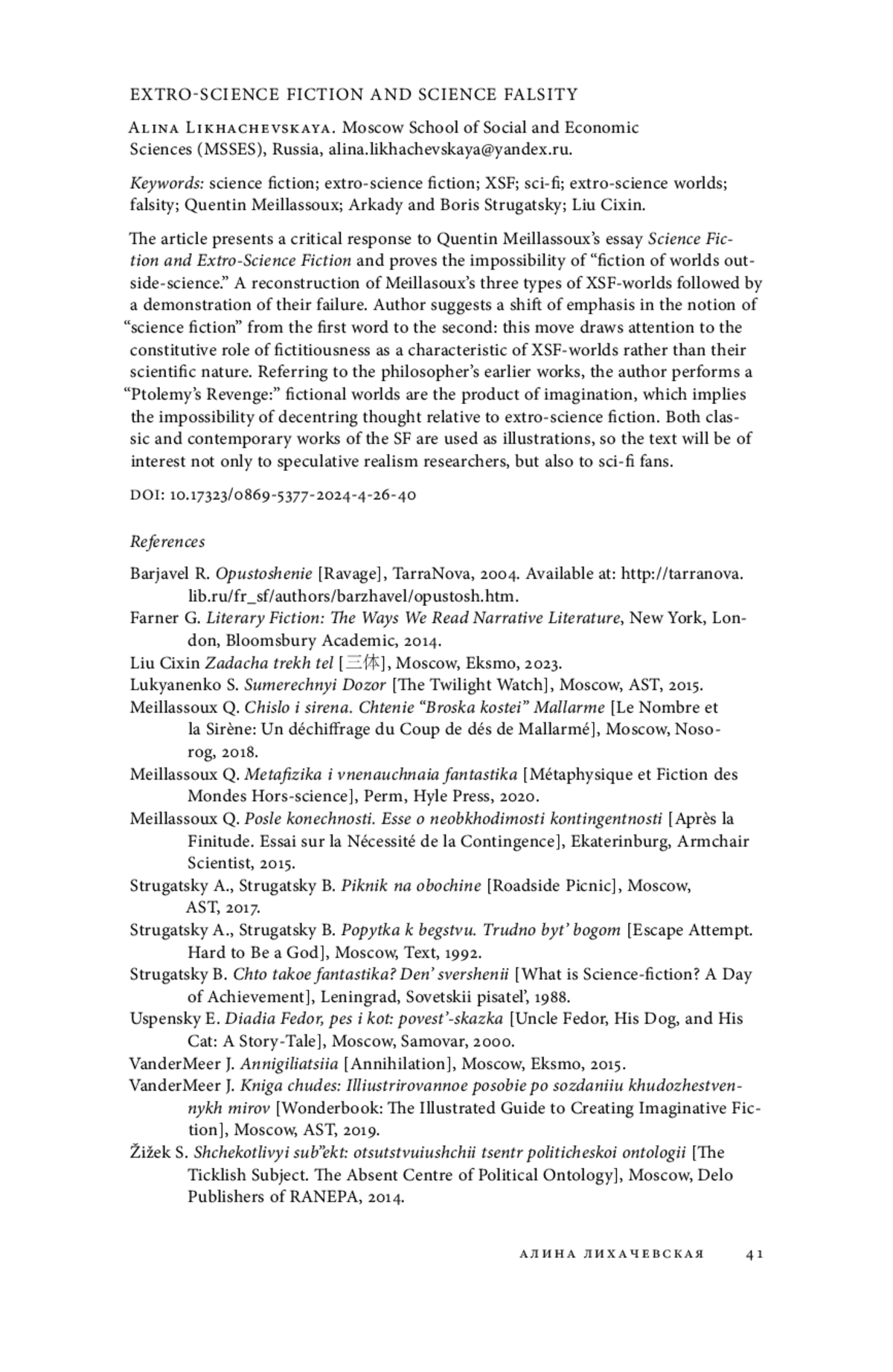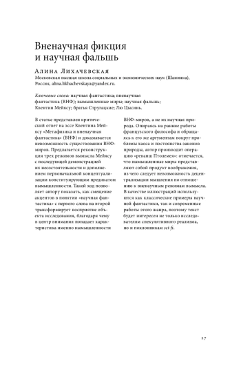 В статье представлен критический ответ на эссе Квентина Мейясу «Метафизика и вненаучная фантастика» (ВНФ) и доказывается невозможность существования ВНФмиров. Предлагается реконструкция трех режимов вымысла Мейясу с последующей демонстрацией их несостоятельности и дополнением первоначальной концептуализации конституирующим предикатом вымышленности. Такой ход позволяет автору показать, как смещение акцентов в понятии «научная фантастика» с первого слова на второй трансформирует восприятие объекта исследования, благодаря чему в центр внимания попадает характеристика именно вымышленности ВНФ-миров, а не их научная природа. Опираясь на ранние работы французского философа и обращаясь к его же аргументам вокруг проблемы хаоса и постоянства законов природы, автор производит операцию «реванш Птолемея»: отмечается, что вымышленные миры представляют собой продукт воображения, из чего следует невозможность децентрализации мышления по отношению к вненаучным режимам вымысла. В качестве иллюстраций используются как классические примеры научной фантастики, так и современные работы этого жанра, поэтому текст будет интересен не только исследователям спекулятивного реализма, но и поклонникам sci-fi