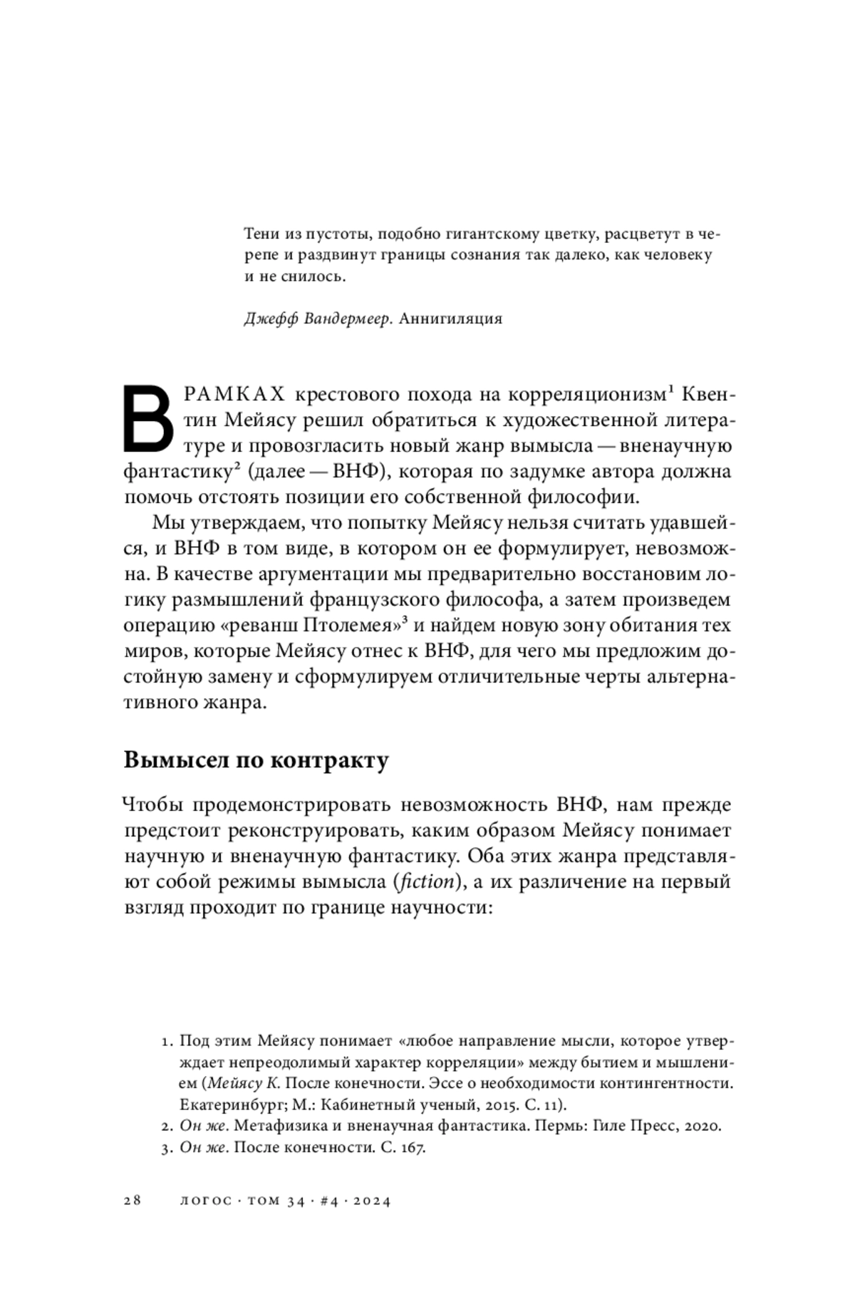 В рамках крестового похода на корреляционизм1 Квентин Мейясу решил обратиться к художественной литературе и провозгласить новый жанр вымысла — вненаучную фантастику2 (далее — ВНФ), которая по задумке автора должна помочь отстоять позиции его собственной философии