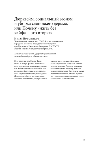 Этот текст не про Эмиля Дюркгейма и не про фильм. Это небольшое упражнение, демонстрирующее, как локальная социологическая теория может быть применена для анализа художественного произведения. Для этого разбирается одно теоретическое напряжение, содержащееся внутри представлений французского социолога о сущности человеческого эгоизма. Отсылка к фильму «Вавилон» (2022) поэтому не более чем иллюстративна. Она тем не менее позволяет наглядно описать идеально-типические характеристики «эгоистического» самоубийства