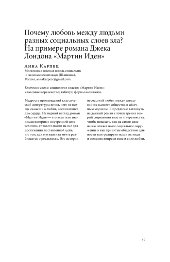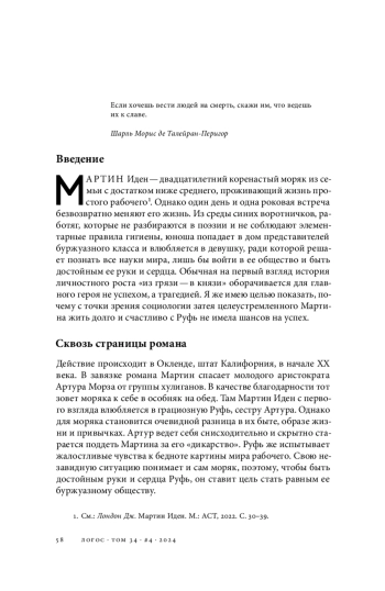 Мудрость произведений классической литературы вечна, чего не всегда скажешь о любви, соединяющей два сердца. На первый взгляд, роман «Мартин Иден» — это всем нам знакомая история о внутренней силе человека, готового пойти на все для достижения поставленной цели, и о том, как его наивная мечта разбивается о реальность. Это история несчастной любви между девушкой из высшего общества и обычным моряком. Я предлагаю взглянуть на данный роман с точки зрения теорий социологии власти и неравенства, чтобы показать, как на самом деле на нас влияет наше социальное окружение и как привитые обществом ценности контролируют наши взгляды и желания вопреки воле и силе любви