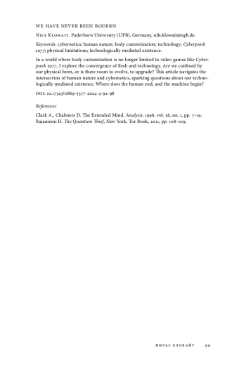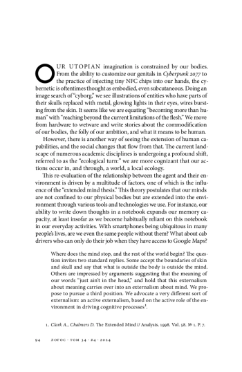 1. Clark A., Chalmers D. The Extended Mind. Analysis, 1998, vol. 58, no. 1, pp. 7-19.