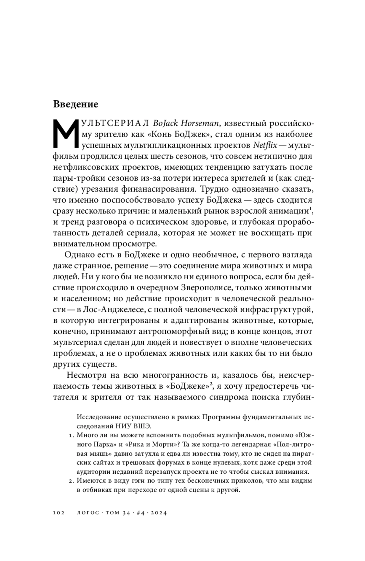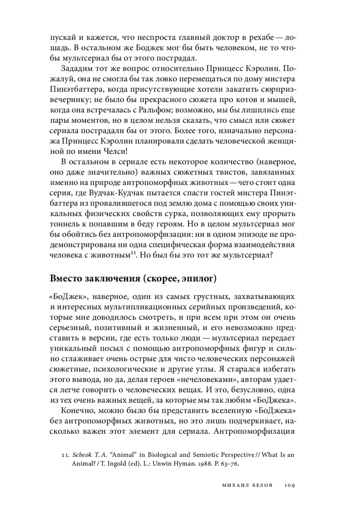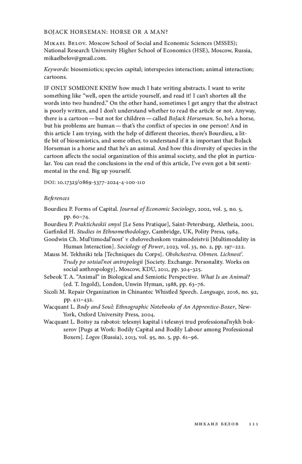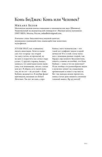КТО БЫ ЗНАЛ, как я ненавижу писать аннотации. Хочется написать что-то вроде «ну открой ты саму статью, ну прочитай, ну не могу я укоротить все слова в пару сотен». С другой стороны, бывает, злишься, что аннотация плохо написана, и не понимаешь, читать статью или нет. В общем, есть такой мультик, но не тот — не детский — Конь БоДжек называется. Я вообще фанат оригиналов, называю его BoJack Horseman. Так вот он конь, а проблемы у него человеческие — вот такой вот конфликт видов в одной личности! И я в этой статье пытаюсь с помощью разных теорий, там Бурдьё, еще немного биосемиотики, понять, а важно ли вообще, что Конь БоДжек — конь и что он животное? И как вообще это разнообразие видов в мультике влияет на социальную организацию и сюжет в частности. Вот там выводы можно прочитать, конец статьи даже немного сентиментальный вышел. Big up yourself.