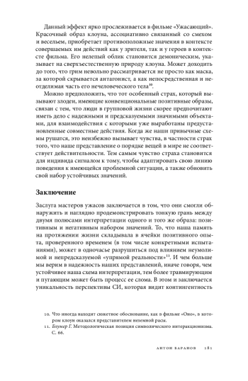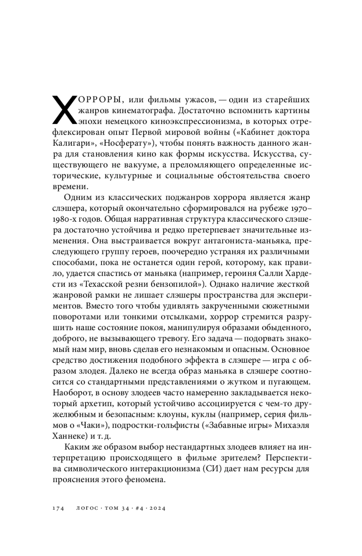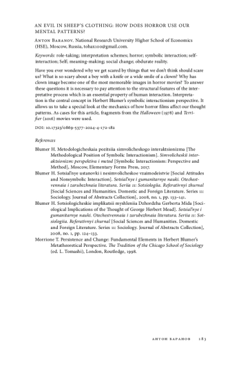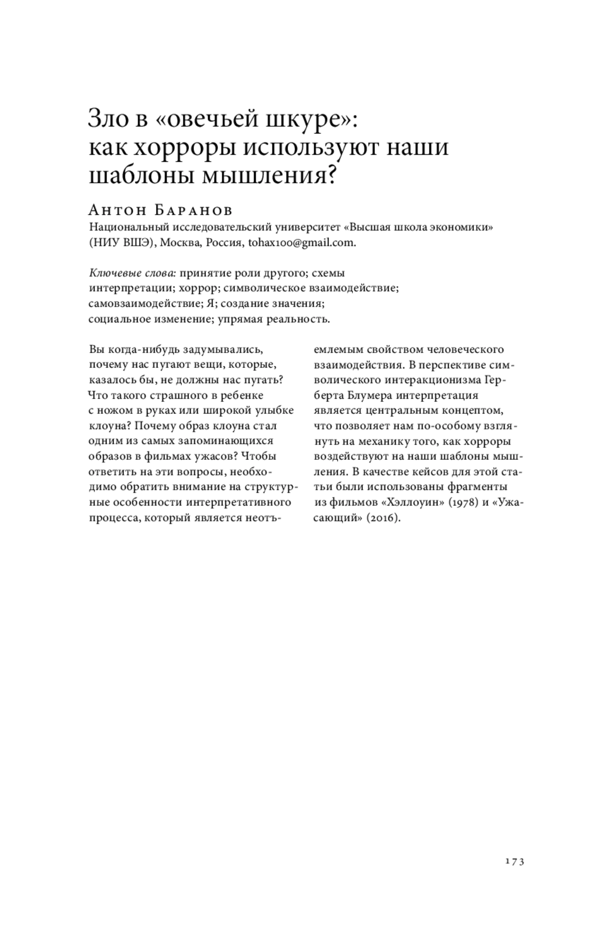 Вы когда-нибудь задумывались, почему нас пугают вещи, которые, казалось бы, не должны нас пугать? Что такого страшного в ребенке с ножом в руках или широкой улыбке клоуна? Почему образ клоуна стал одним из самых запоминающихся образов в фильмах ужасов? Чтобы ответить на эти вопросы, необходимо обратить внимание на структурные особенности интерпретативного процесса, который является неотъемлемым свойством человеческого взаимодействия. В перспективе символического интеракционизма Герберта Блумера интерпретация является центральным концептом, что позволяет нам по-особому взглянуть на механику того, как хорроры воздействуют на наши шаблоны мышления. В качестве кейсов для этой статьи были использованы фрагменты из фильмов «Хэллоуин» (1978) и «Ужасающий» (2016)