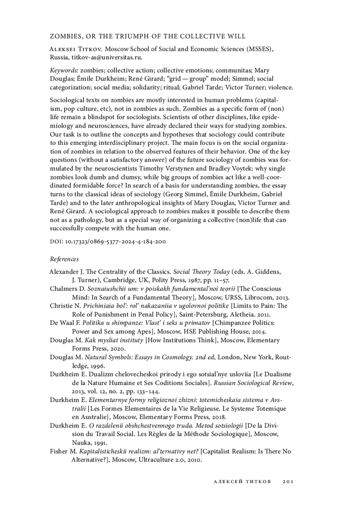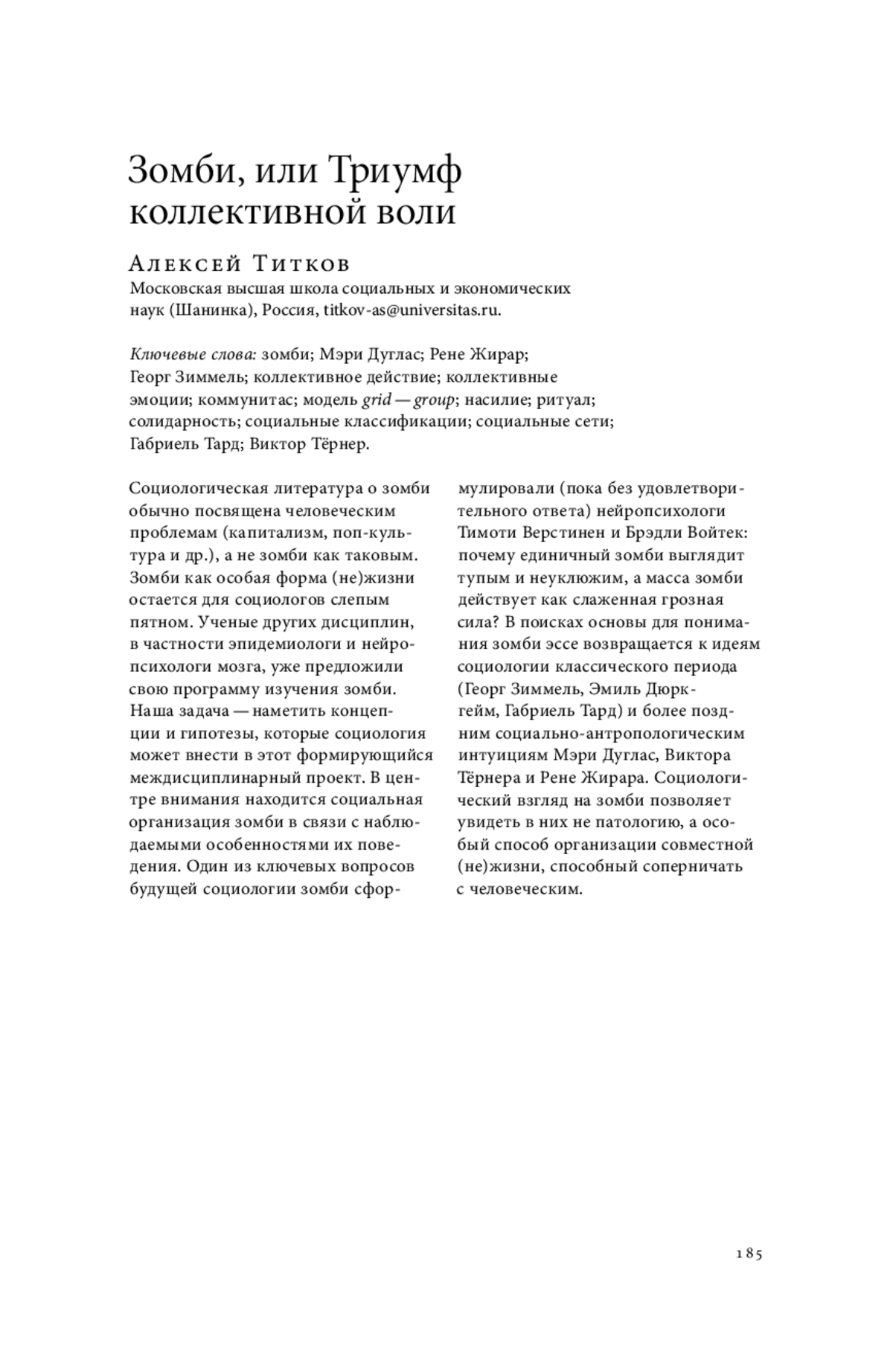 Социологическая литература о зомби обычно посвящена человеческим проблемам (капитализм, поп-культура и др.), а не зомби как таковым. Зомби как особая форма (не)жизни остается для социологов слепым пятном. Ученые других дисциплин, в частности эпидемиологи и нейропсихологи мозга, уже предложили свою программу изучения зомби. Наша задача — наметить концепции и гипотезы, которые социология может внести в этот формирующийся междисциплинарный проект. В центре внимания находится социальная организация зомби в связи с наблюдаемыми особенностями их поведения. Один из ключевых вопросов будущей социологии зомби сформулировали (пока без удовлетворительного ответа) нейропсихологи Тимоти Верстинен и Брэдли Войтек: почему единичный зомби выглядит тупым и неуклюжим, а масса зомби действует как слаженная грозная сила? В поисках основы для понимания зомби эссе возвращается к идеям социологии классического периода (Георг Зиммель, Эмиль Дюркгейм, Габриель Тард) и более поздним социально-антропологическим интуициям Мэри Дуглас, Виктора Тёрнера и Рене Жирара. Социологический взгляд на зомби позволяет увидеть в них не патологию, а особый способ организации совместной (не)жизни, способный соперничать с человеческим