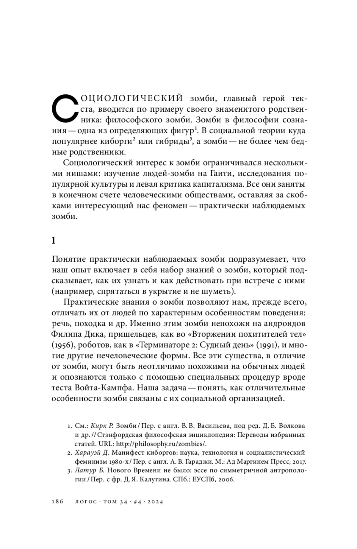 Социологический интерес к зомби ограничивался несколькими нишами: изучение людей-зомби на Гаити, исследования популярной культуры и левая критика капитализма. Все они заняты в конечном счете человеческими обществами, оставляя за скобками интересующий нас феномен — практически наблюдаемых зомби