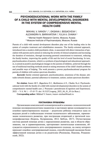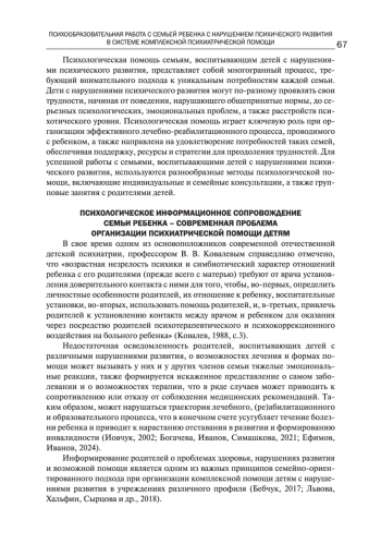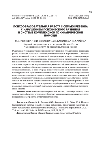 Организация комплексной психиатрической и клинико-психологической помощи несовершеннолетним пациентам в настоящее время основывается на семейно-ориентированном подходе - родителям ребенка отводится одна из ведущих ролей в стабилизации течения психического заболевания, гармони- зации психического развития, при построении вторичной и третичной психоnрофилактики (Корень, Куприянова, 2012; Бебчук, 2017). Отечественная система ранней помощи детям с нарушениями развития, как в области образования, так и здравоохранения, претерпевает значительные изменения, обсуждается ограниченность дето-центрированного подхода, на смену которого приходит семейно-центрированный подход, способствующий оказанию более эффективной помощи детям и их родителям (Разенкова, Павлова, Романов ский, 2022).