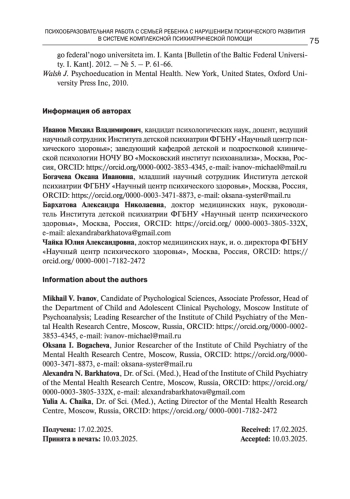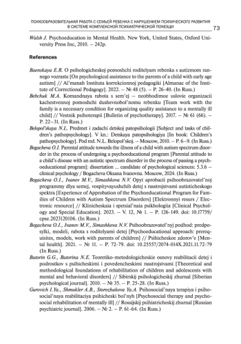 5. Богачева О.И., Иванов М.В., Симашкова Н.В. Опыт апробации психообразовательной программы для семей, воспитывающих детей с расстройствами аутистического спектра [Электронный ресурс] // Клиническая и специальная психология. 2023. - Т. 12, № 1. - С. 126-149.