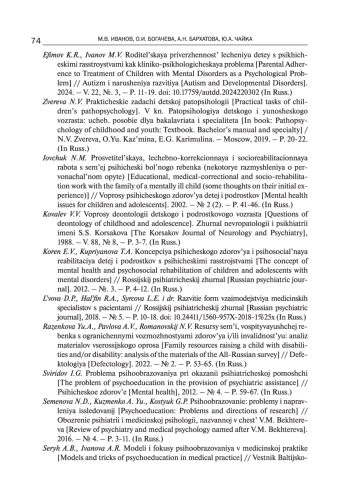 9. Ефимов К.Р., Иванов М.В. Родительская приверженность лечению детей с психическими расстройствами как клинико-психологическая проблема // Аутизм и нарушения развития. 2024. - Т. 22, № 3. - С. 11-19. DOI: 10.17759/autdd.2024220302