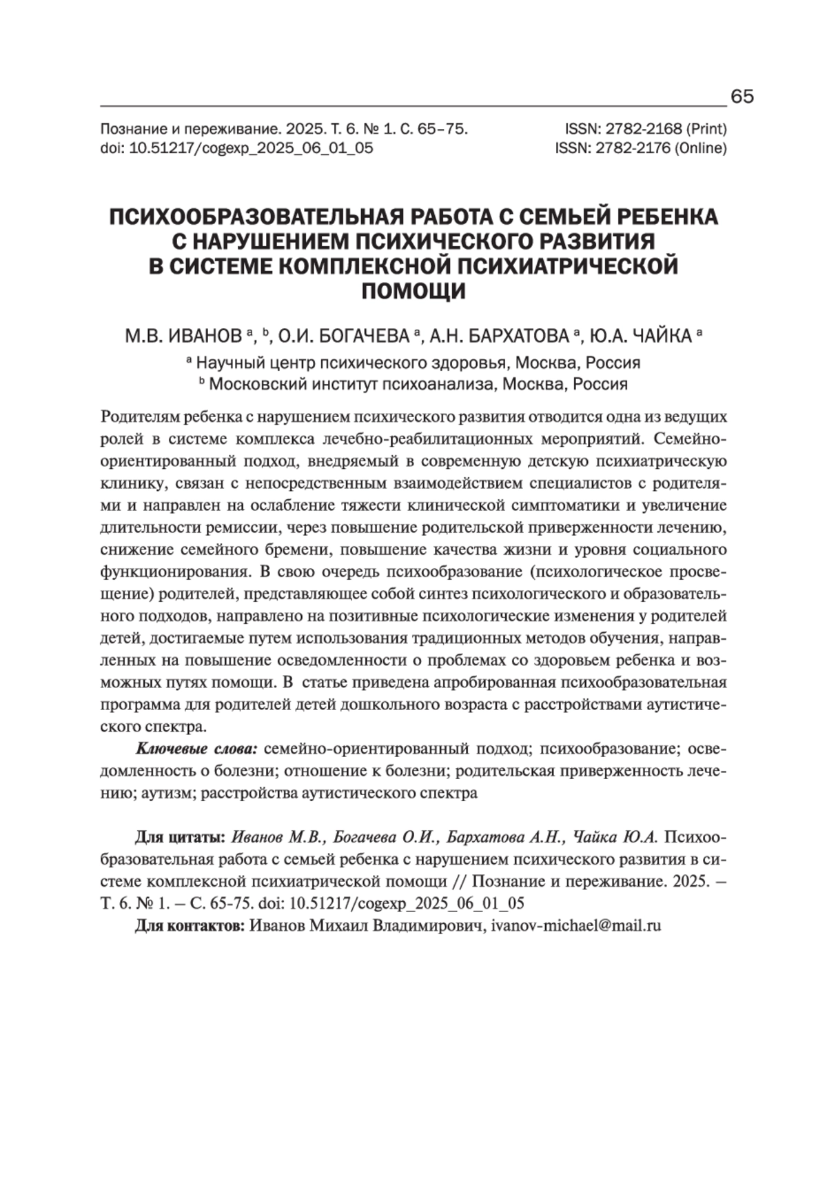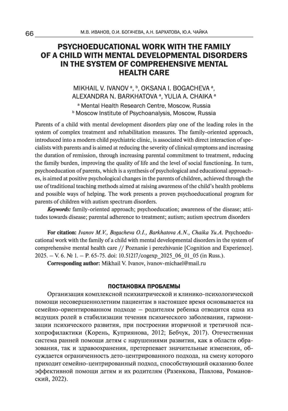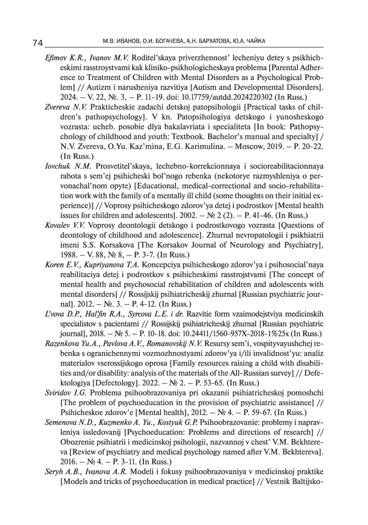 6. Богачева О.И., Иванов М.В., Симашкова Н.В. Психообразовательный подход: предпосылки, модели, работа с родителями детей // Психическое здоровье. 2021. - № 11. - C. 72-79. doi: 25557/2074-014X.2021.11.72-79.