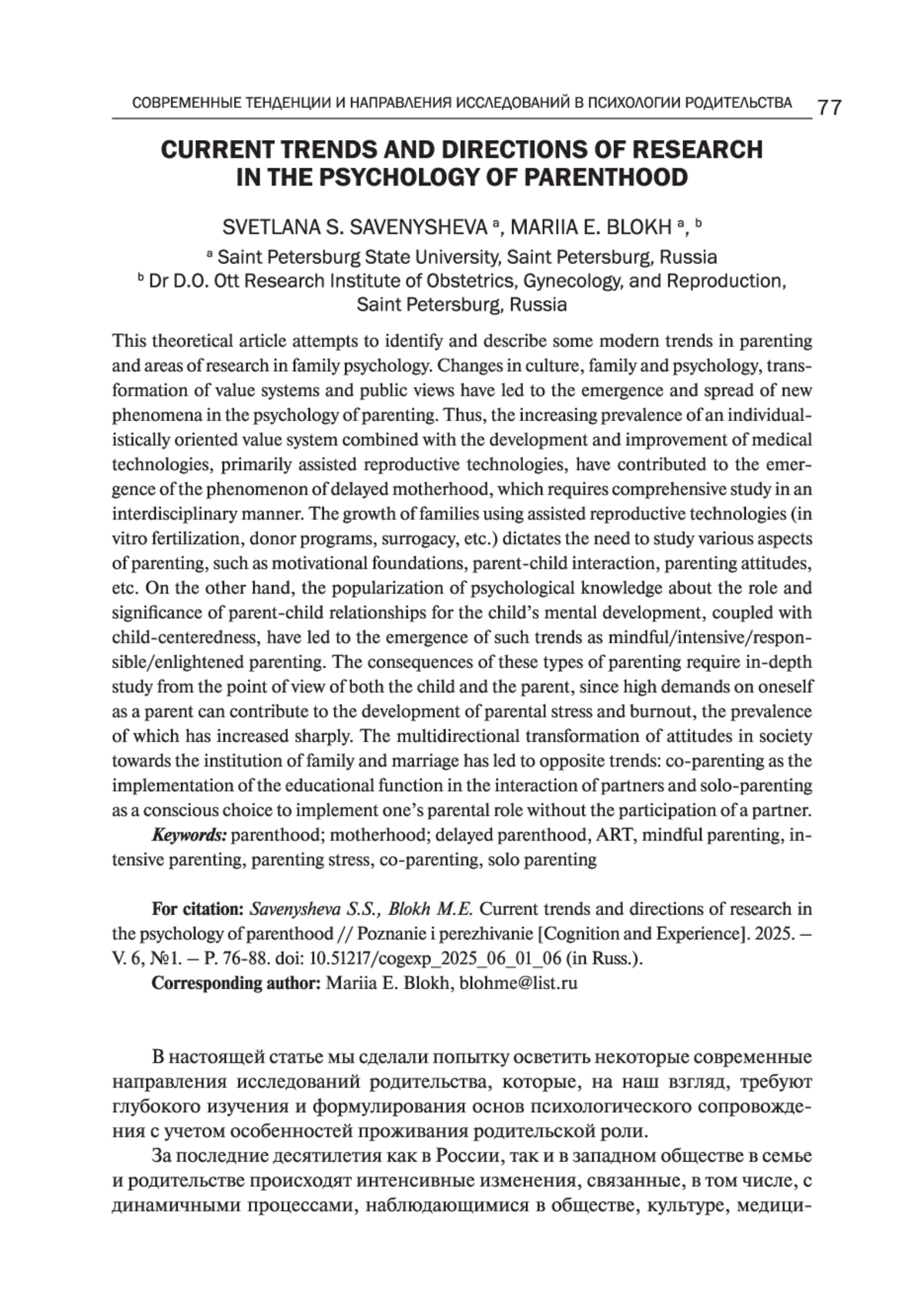 В данной теоретической статье предпринята попытка выделить и описать некоторые современные тенденции родительства и направления исследований в семейной психологии. Изменения в культуре, семье и психологии, трансформация ценностных установок, общественных взглядов привели к появлению и распространению новых феноменов в психологии родительства. Так, все большее превалирование индивидуалистически ориентированной системы ценностей в сочетании с развитием и совершенствованием медицинских технологий (в первую очередь вспомогательных репродуктивных) способствовали появлению феномена отложенного материнства, который требует всестороннего изучения в междисциплинарном ключе. Рост семей, использующих вспомогательные репродуктивные технологии (экстракорпоральное оплодотворение, донорские программы, суррогатное материнство и др.), диктует необходимость изучения различных аспектов их родительства, таких как мотивационные основы, взаимодействие родитель-ребенок, установки на воспитание и т. п. С другой стороны, популяризация психологических знаний о роли и значении детско-родительских отношений для психического развития ребенка вкупе с детоцентрированностью привели к появлению таких направлений, как осознанное/интенсивное/ответственное/просвещенное родительство. Последствия таких типов родительства требуют глубокого изучения точек зрения как ребенка, так и самого родителя, так как высокие требования в себе (как родителю) могут способствовать развитию родительского стресса и выгорания, уровень распространенности которых резко возрос. Разнонаправленная трансформация отношения в обществе к институту семьи и брака привела к противоположным тенденциям: со-родительства - как реализации воспитательной функции во взаимодействии партнеров; соло родительства - как осознанного выбора реализации своей родительской роли без участия партнера.