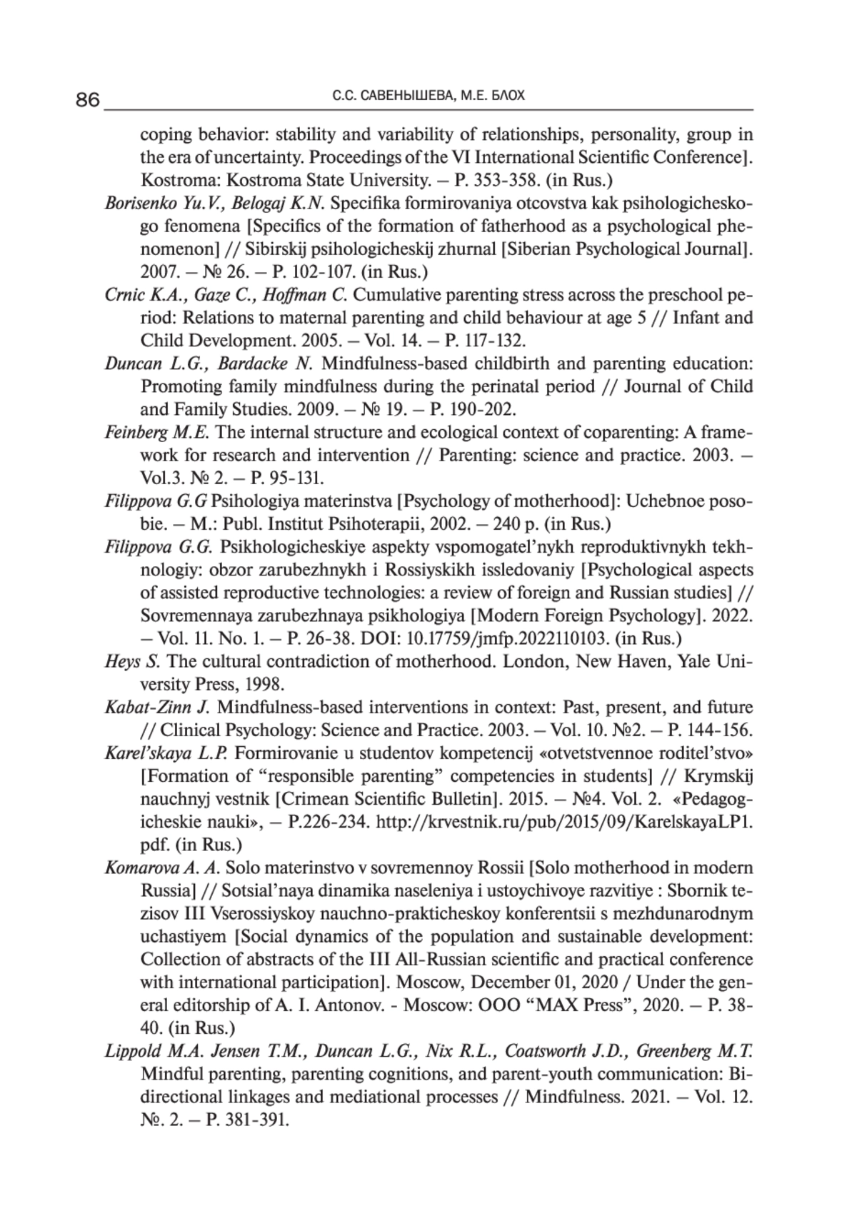 12. Савенышева С.С., Аникина В.О., Мельдо Э.В. Факторы родительского стресса матерей детей раннего и дошкольного возраста: анализ зарубежных исследований [Электронный ресурс] // Современная зарубежная психология. 2019. Т. 8. № 4. - С. 38-48. DOI: 10.17759/jmfp.2019080404