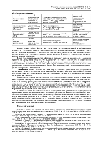 1. Андрианов В.В., Сироткин М.С., Баженова М.В. Международные энергетические проекты России как инструмент “мягкой силы” // Гуманитарные науки. Вестник Финансового университета. 2025. Т. 15, № 1. С. 19-33. DOI: 10.26794/2226-7867-2025-15-1-19-33 EDN: VYNSIM